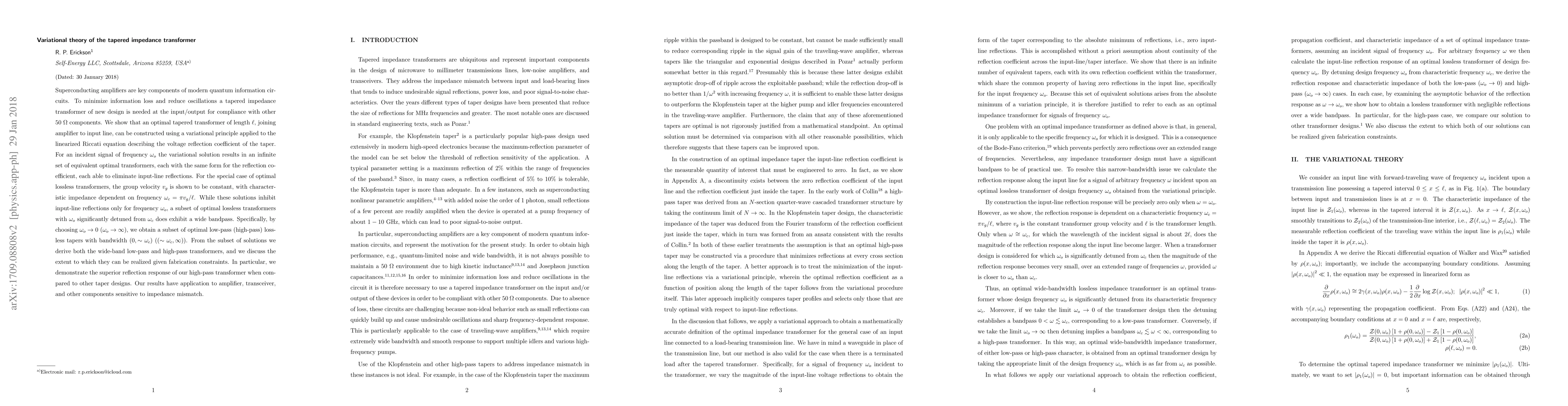 Superconducting amplifiers are key components of modern quantum information circuits. To minimize information loss and reduce oscillations a tapered impedance transformer of new design is needed at the input/output for compliance with other 50 $\Omega$ components. We show that an optimal tapered transformer of length $\ell$, joining amplifier to input line, can be constructed using a variational principle applied to the linearized Riccati equation describing the voltage reflection coefficient of the taper. For an incident signal of frequency $\omega_o$ the variational solution results in an infinite set of equivalent optimal transformers, each with the same form for the reflection coefficient, each able to eliminate input-line reflections. For the special case of optimal lossless transformers, the group velocity $v_g$ is shown to be constant, with characteristic impedance dependent on frequency $\omega_c=\pi v_g / \ell$. While these solutions inhibit input-line reflections only for frequency $\omega_o$, a subset of optimal lossless transformers with $\omega_o$ significantly detuned from $\omega_c$ does exhibit a wide bandpass. Specifically, by choosing $\omega_o\rightarrow 0$ ($\omega_o\rightarrow\infty$), we obtain a subset of optimal low-pass (high-pass) lossless tapers with bandwidth $(0,\sim\omega_c)$ ($(\sim\omega_c,\infty)$). From the subset of solutions we derive both the wide-band low-pass and high-pass transformers, and we discuss the extent to which they can be realized given fabrication constraints. In particular, we demonstrate the superior reflection response of our high-pass transformer when compared to other taper designs. Our results have application to amplifier, transceiver, and other components sensitive to impedance mismatch.
