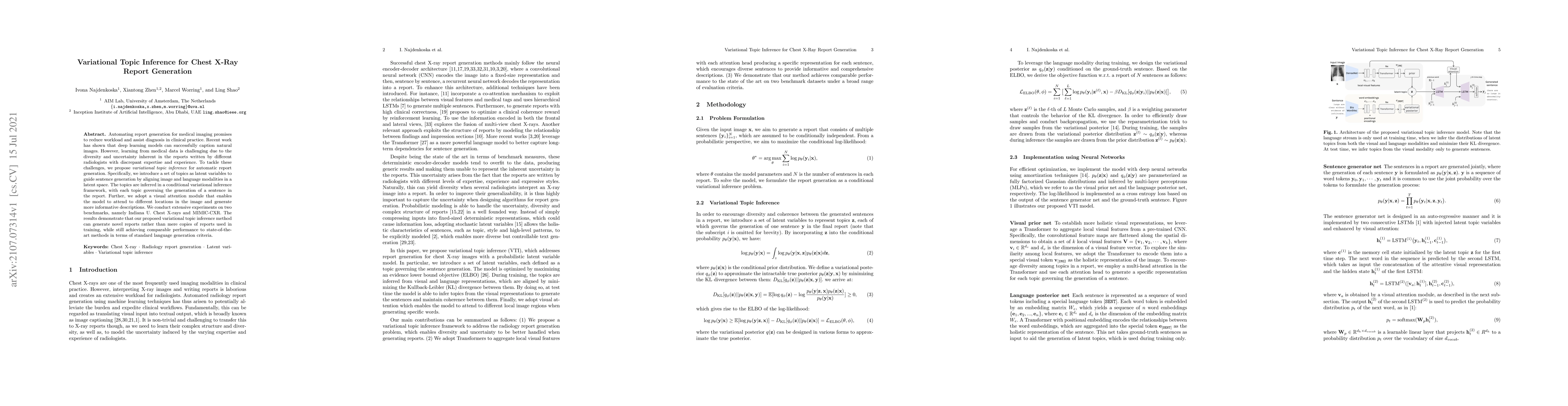 This paper proposes a variational topic inference method for generating automatic chest X-ray reports, utilizing latent topics to guide sentence generation and a visual attention module to focus on relevant image areas. Experiments show the model can produce novel reports while maintaining performance comparable to state-of-the-art methods.