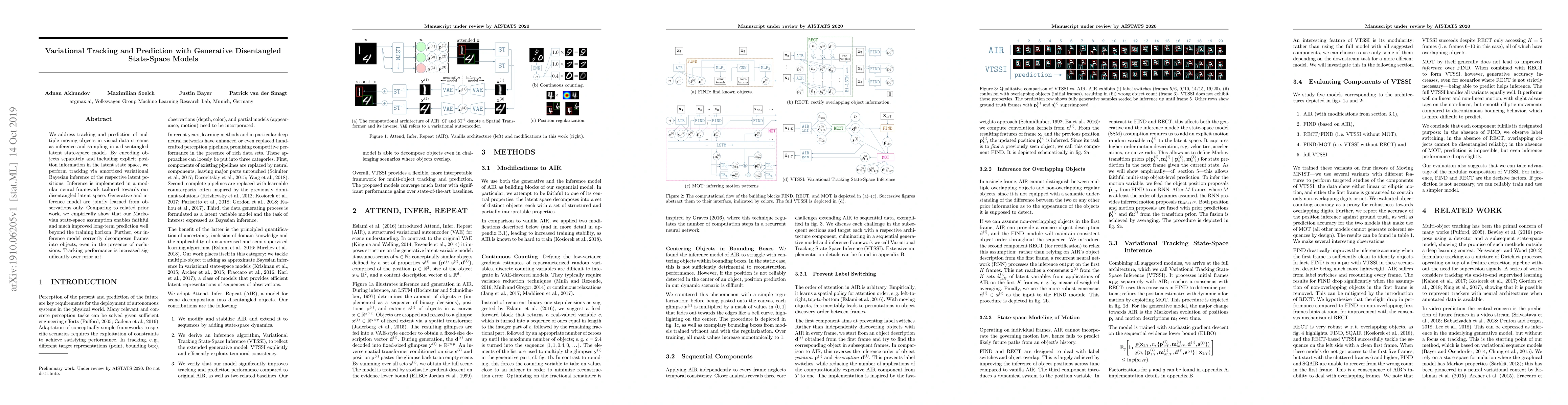 We address tracking and prediction of multiple moving objects in visual data streams as inference and sampling in a disentangled latent state-space model. By encoding objects separately and including explicit position information in the latent state space, we perform tracking via amortized variational Bayesian inference of the respective latent positions. Inference is implemented in a modular neural framework tailored towards our disentangled latent space. Generative and inference model are jointly learned from observations only. Comparing to related prior work, we empirically show that our Markovian state-space assumption enables faithful and much improved long-term prediction well beyond the training horizon. Further, our inference model correctly decomposes frames into objects, even in the presence of occlusions. Tracking performance is increased significantly over prior art.