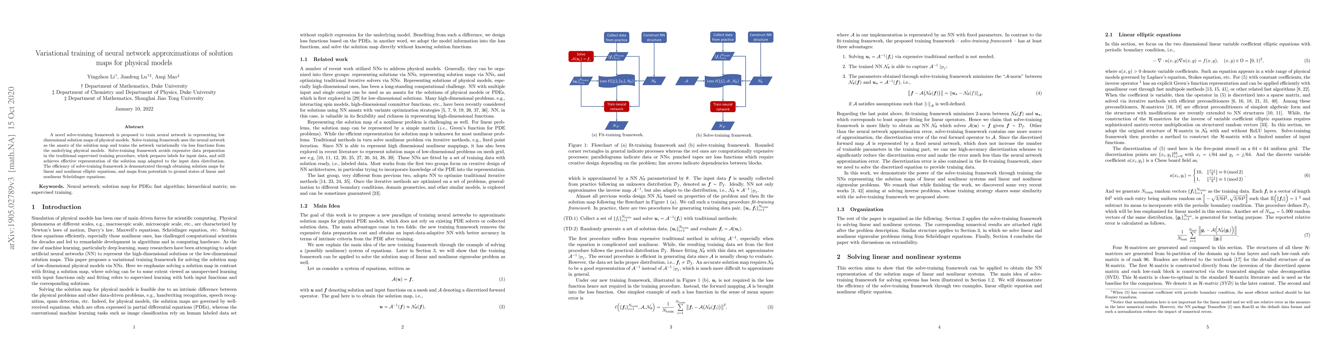 A novel solve-training framework is proposed to train neural network in representing low dimensional solution maps of physical models. Solve-training framework uses the neural network as the ansatz of the solution map and train the network variationally via loss functions from the underlying physical models. Solve-training framework avoids expensive data preparation in the traditional supervised training procedure, which prepares labels for input data, and still achieves effective representation of the solution map adapted to the input data distribution. The efficiency of solve-training framework is demonstrated through obtaining solutions maps for linear and nonlinear elliptic equations, and maps from potentials to ground states of linear and nonlinear Schr\"odinger equations.