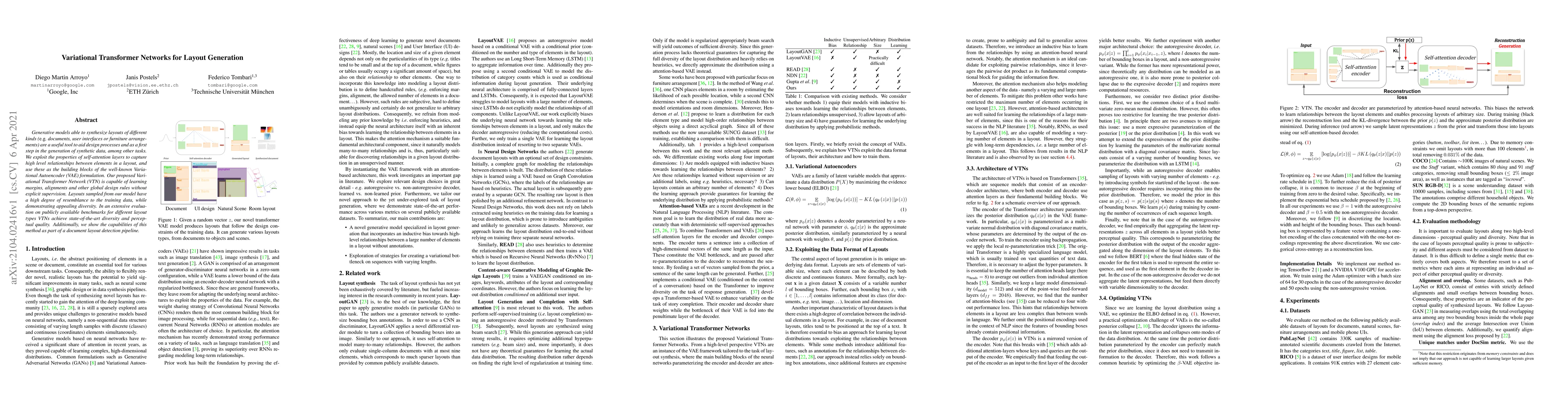 The paper proposes Variational Transformer Networks (VTN) for generating diverse and high-quality layouts using self-attention layers within a Variational Autoencoder framework, achieving state-of-the-art results on multiple layout benchmarks. The method learns global design rules without explicit supervision, demonstrating both high resemblance to training data and appealing diversity.
