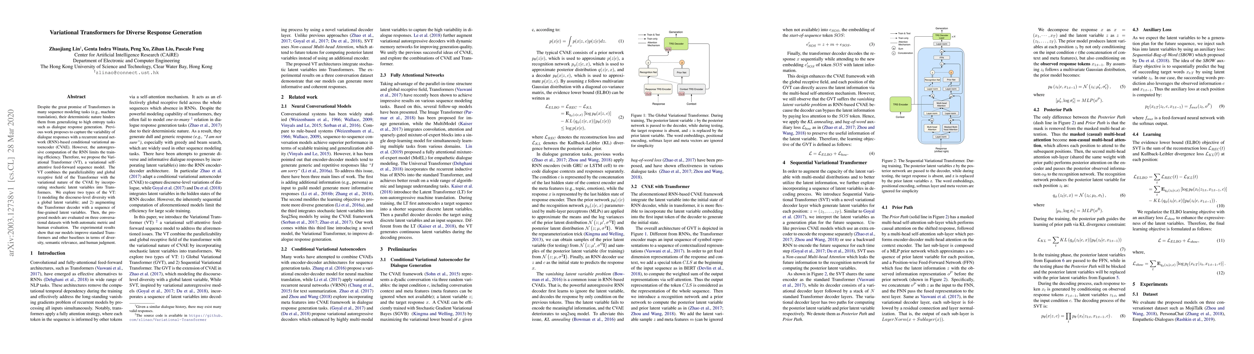 The Variational Transformer (VT) integrates the parallelizability and global context of Transformers with the variational nature of CVAEs to generate diverse, context-aware dialogue responses, outperforming standard Transformers and other baselines in diversity, relevance, and human judgment. Two VT variants are explored: one using a global latent variable for discourse-level diversity and another using fine-grained latent variables in the decoder.