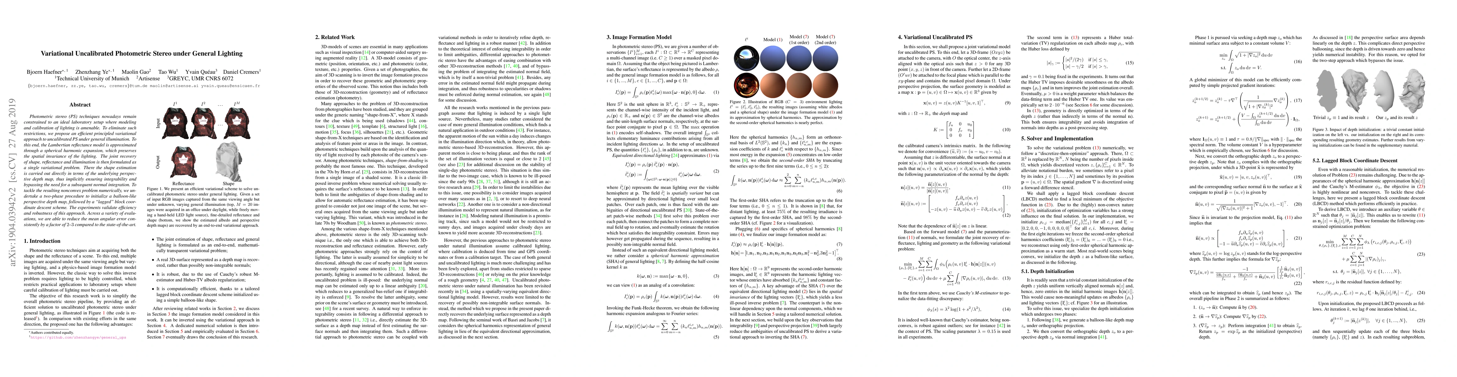 This paper proposes a variational approach for uncalibrated photometric stereo under general lighting conditions, approximating the Lambertian reflectance model via spherical harmonics. The method efficiently estimates shape, reflectance, and illumination in a single variational problem, achieving significant reductions in mean angular error compared to state-of-the-art techniques.