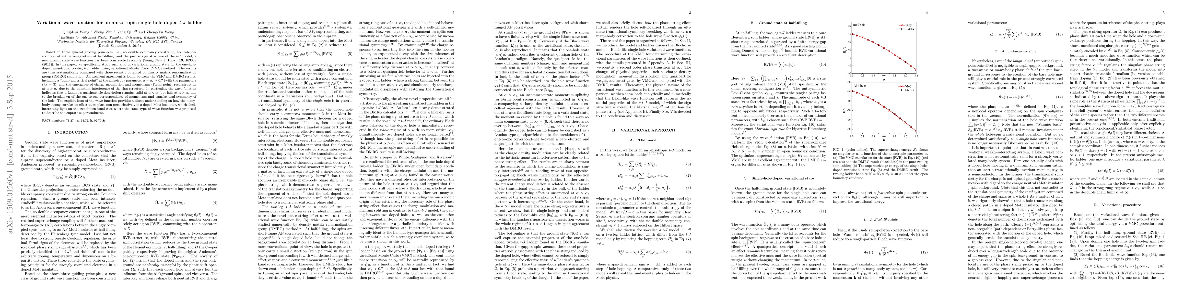 Based on three general guiding principles, i.e., no double occupancy constraint, accurate description of antiferromagnetism at half-filling, and the precise sign structure of the $t$-$J$ model, a new ground state wave function has been constructed recently [Weng, New J. Phys. 13, 103039 (2011)]. In this paper, we specifically study such kind of variational ground state for the one-hole-doped anisotropic two-leg $t$-$J$ ladder using variational Monte Carlo (VMC) method. The results are then systematically compared with those recently obtained by density matrix renormalization group (DMRG) simulation. An excellent agreement is found between the VMC and DMRG results, including a "quantum critical point" at the anisotropy parameter $\alpha=\alpha_c\approx0.7$ (with the parameters $t/J=3$), and the emergence of charge modulation and momentum (Fermi point) reconstruction at $\alpha>\alpha_c$ due to the quantum interference of the sign structure. In particular, the wave function indicates that a Landau's quasiparticle description remains valid at $\alpha<\alpha_c$ but fails at $\alpha>\alpha_c$ due to the breakdown of the one-to-one correspondence of momentum and translational symmetry of the hole. The explicit form of the wave function provides a direct understanding on how the many-body strong correlation effect takes place non-perturbatively in a doped Mott insulator, which sheds interesting light on the two-dimensional case where the same type of wave function was proposed to describe the cuprate superconductor.