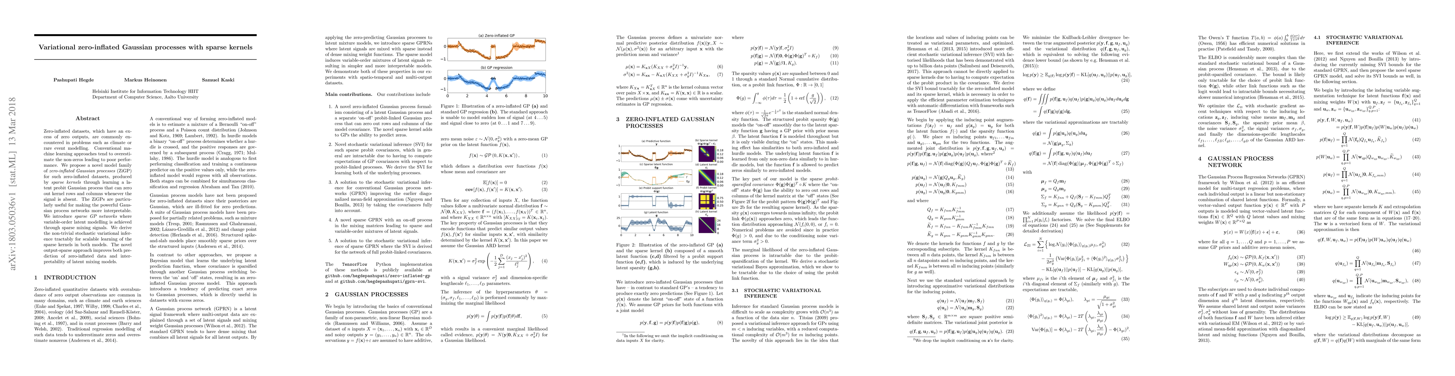 This paper introduces a novel zero-inflated Gaussian process (ZiGP) model with sparse kernels to better handle datasets with an excess of zero outputs, improving both prediction accuracy and interpretability over conventional methods. The model employs a latent probit Gaussian process and sparse GP networks for scalable learning, enabling effective handling of zero-inflated data.
