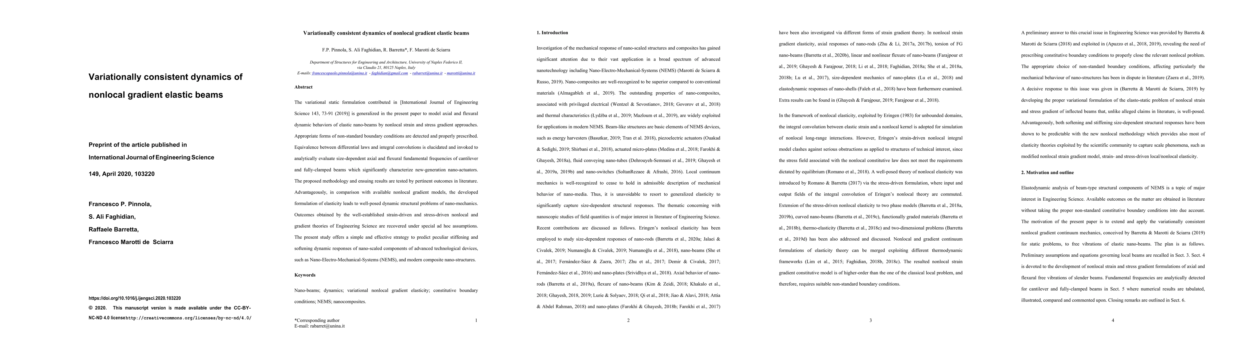 This paper generalizes a variational static formulation to model dynamic behaviors of elastic nano-beams using nonlocal strain and stress gradient approaches, evaluating size-dependent axial and flexural frequencies. The developed formulation offers a more consistent dynamic structural problem in nano-mechanics compared to existing nonlocal gradient models.