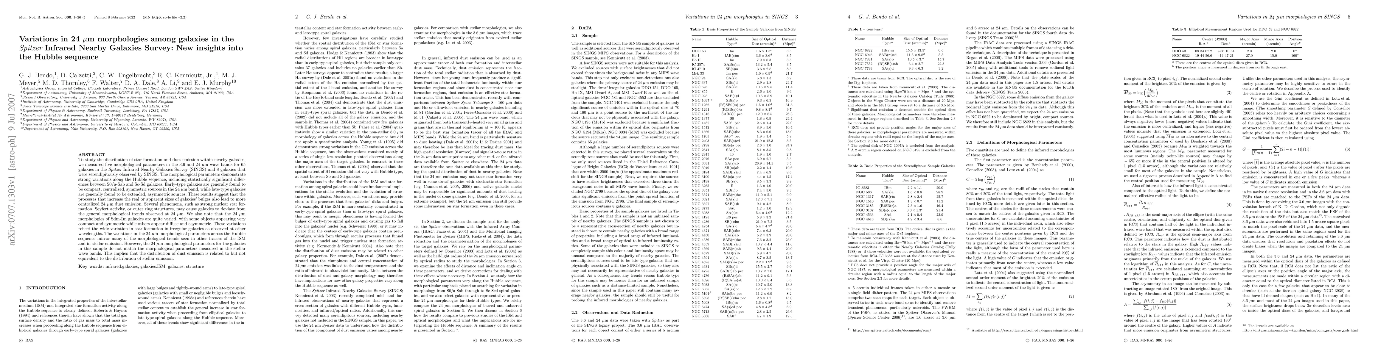 To study the distribution of star formation and dust emission within nearby galaxies, we measured five morphological parameters in the 3.6 and 24 micron wave bands for 65 galaxies in the Spitzer Infrared Nearby Galaxies Survey (SINGS) and 8 galaxies that were serendipitously observed by SINGS. The morphological parameters demonstrate strong variations along the Hubble sequence, including statistically significant differences between S0/a-Sab and Sc-Sd galaxies. Early-type galaxies are generally found to be compact, centralized, symmetric sources in the 24 micron band, while late-type galaxies are generally found to be extended, asymmetric sources. These results suggest that the processes that increase the real or apparent sizes of galaxies' bulges also lead to more centralized 24 micron dust emission. Several phenomena, such as strong nuclear star formation, Seyfert activity, or outer ring structures, may cause galaxies to deviate from the general morphological trends observed at 24 microns. We also note that the 24 micron morphologies of Sdm-Im galaxies are quite varied, with some objects appearing very compact and symmetric while others appear diffuse and asymmetric. These variations reflect the wide variation in star formation in irregular galaxies as observed at other wavelengths. The variations in the 24 micron morphological parameters across the Hubble sequence mirror many of the morphological trends seen in other tracers of the ISM and in stellar emission. However, the 24 micron morphological parameters for the galaxies in this sample do not match the morphological parameters measured in the stellar wave bands. This implies that the distribution of dust emission is related to but not equivalent to the distribution of stellar emission.