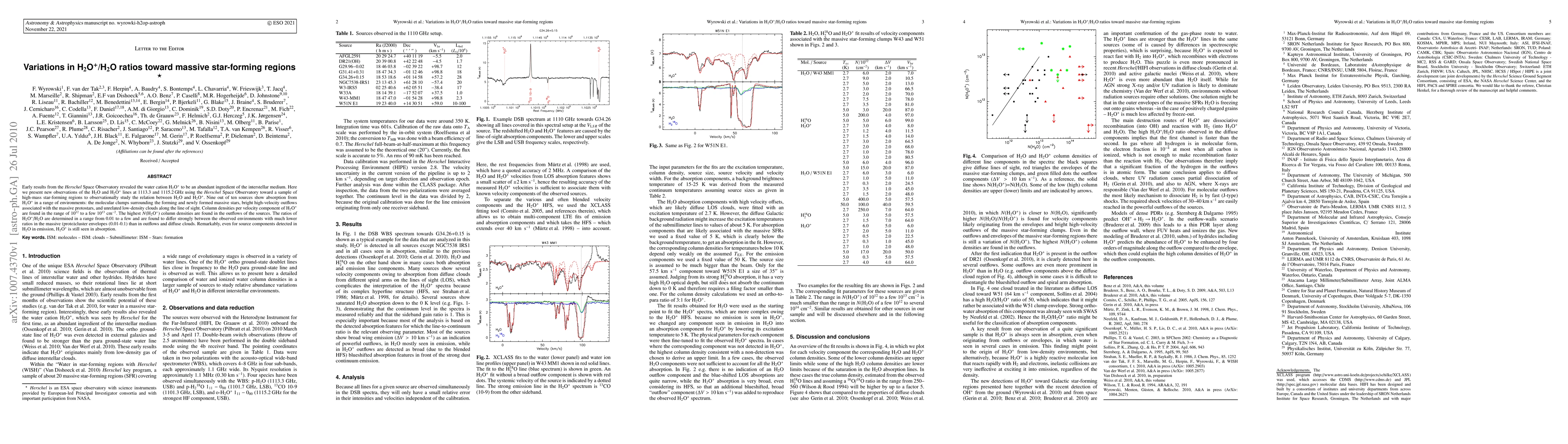 Early results from the Herschel Space Observatory revealed the water cation H2O+ to be an abundant ingredient of the interstellar medium. Here we present new observations of the H2O and H2O+ lines at 1113.3 and 1115.2 GHz using the Herschel Space Observatory toward a sample of high-mass star-forming regions to observationally study the relation between H2O and H2O+ . Nine out of ten sources show absorption from H2O+ in a range of environments: the molecular clumps surrounding the forming and newly formed massive stars, bright high-velocity outflows associated with the massive protostars, and unrelated low-density clouds along the line of sight. Column densities per velocity component of H2 O+ are found in the range of 10^12 to a few 10^13 cm-2 . The highest N(H2O+) column densities are found in the outflows of the sources. The ratios of H2O+/H2O are determined in a range from 0.01 to a few and are found to differ strongly between the observed environments with much lower ratios in the massive (proto)cluster envelopes (0.01-0.1) than in outflows and diffuse clouds. Remarkably, even for source components detected in H2O in emission, H2O+ is still seen in absorption.