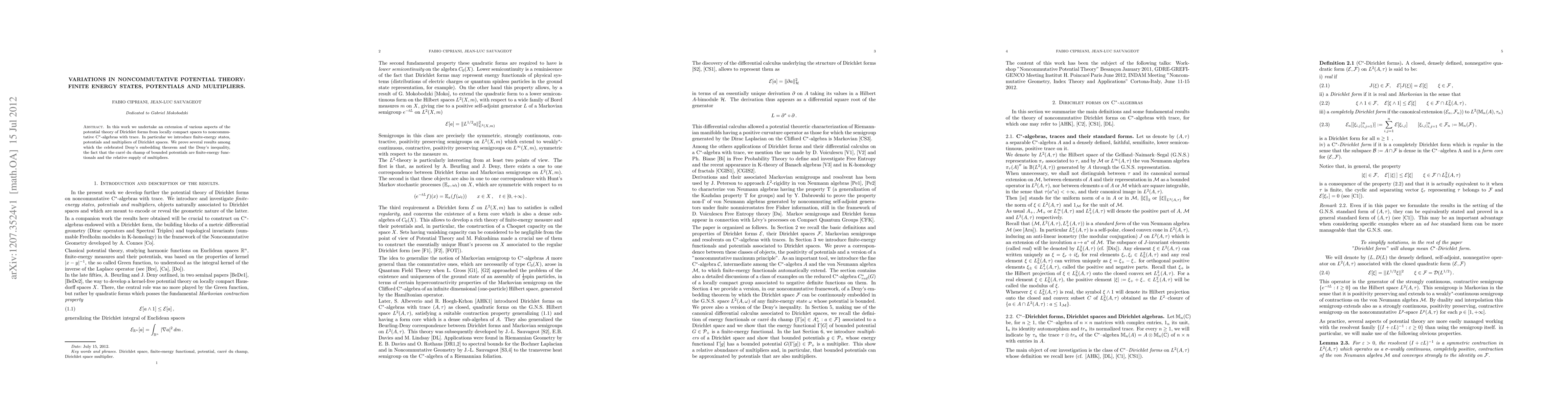 In this work we undertake an extension of various aspects of the potential theory of Dirichlet forms from locally compact spaces to noncommutative C*-algebras with trace. In particular we introduce finite-energy states, potentials and multipliers of Dirichlet spaces. We prove several results among which the celebrated Deny's embedding theorem and the Deny's inequality, the fact that the carre' du champ of bounded potentials are finite-energy functionals and the relative supply of multipliers.