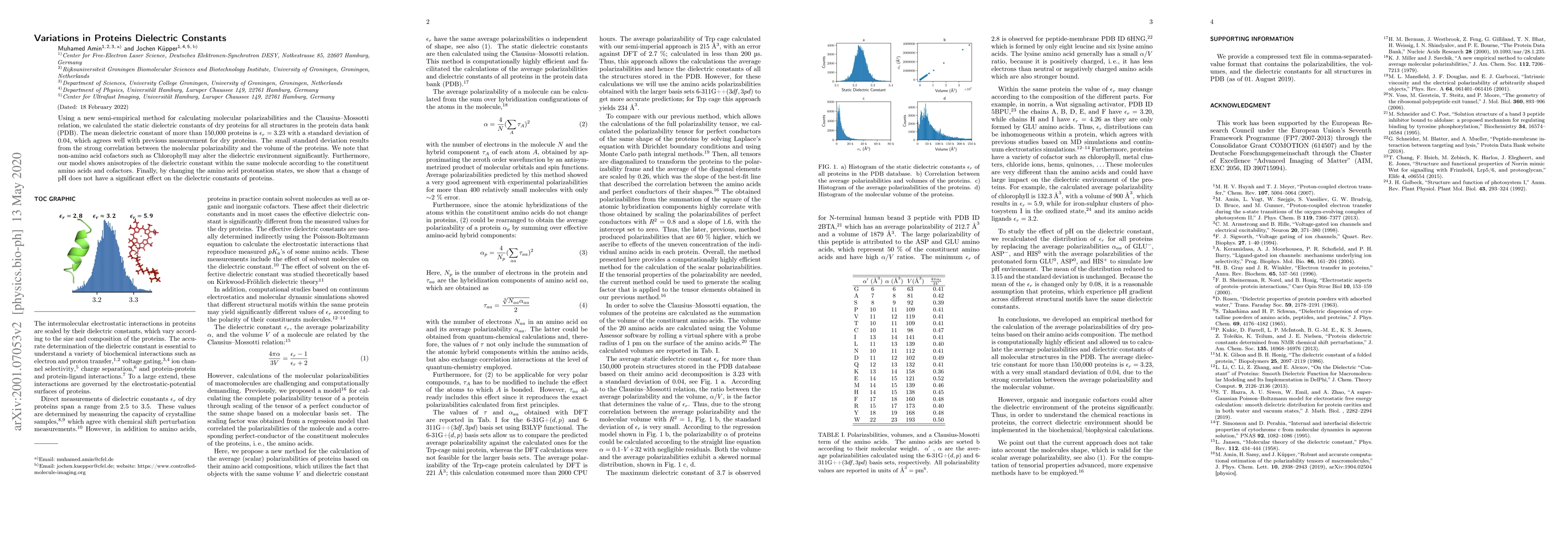 Using a new semi empirical method for calculating molecular polarizabilities and the Clausius Mossotti relation, we calculated the static dielectric constants of dry proteins for all structures in the protein data bank (PDB). The mean dielectric constant of more than 150,000 proteins is 3.23 with a standard deviation of 0.04, which agrees well with previous measurement for dry proteins. The small standard deviation results from the strong correlation between the molecular polarizability and the volume of the proteins. We note that non amino acid cofactors such as Chlorophyll may alter the dielectric environment significantly. Furthermore, our model shows anisotropies of the dielectric constant within the same molecule according to the constituent amino acids and cofactors. Finally, by changing the amino acid protonation states, we show that a change of pH does not have a significant effect on the dielectric constants of proteins.