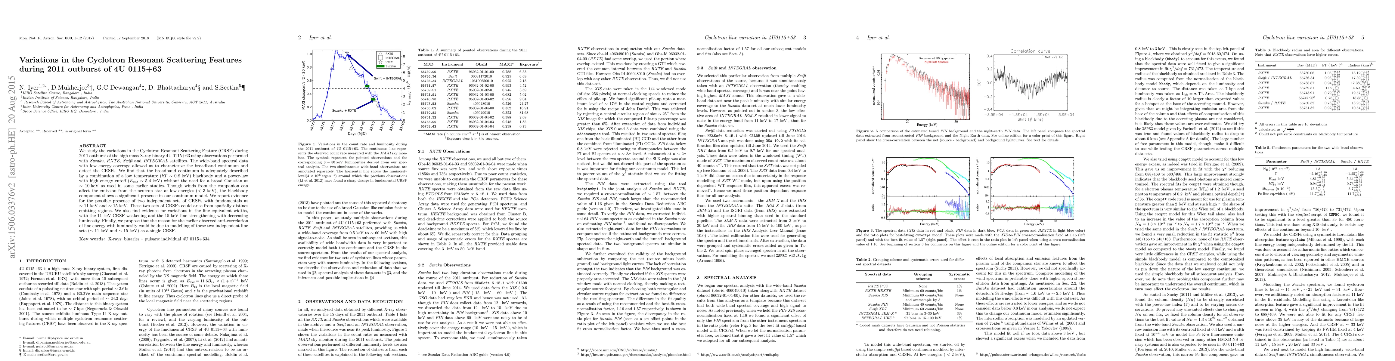 We study the variations in the Cyclotron Resonant Scattering Feature (CRSF) during 2011 outburst of the high mass X-ray binary 4U 0115+63 using observations performed with Suzaku, RXTE, Swift and INTEGRAL satellites. The wide-band spectral data with low energy coverage allowed us to characterize the broadband continuum and detect the CRSFs. We find that the broadband continuum is adequately described by a combination of a low temperature (kT ~ 0.8 keV) blackbody and a power-law with high energy cutoff (Ecut ~ 5.4 keV) without the need for a broad Gaussian at ~ 10 keV as used in some earlier studies. Though winds from the companion can affect the emission from the neutron star at low energies (< 3 keV), the blackbody component shows a significant presence in our continuum model. We report evidence for the possible presence of two independent sets of CRSFs with fundamentals at ~ 11 keV and ~ 15 keV. These two sets of CRSFs could arise from spatially distinct emitting regions. We also find evidence for variations in the line equivalent widths, with the 11 keV CRSF weakening and the 15 keV line strengthening with decreasing luminosity. Finally, we propose that the reason for the earlier observed anti-correlation of line energy with luminosity could be due to modelling of these two independent line sets (~ 11 keV and ~ 15 keV) as a single CRSF.