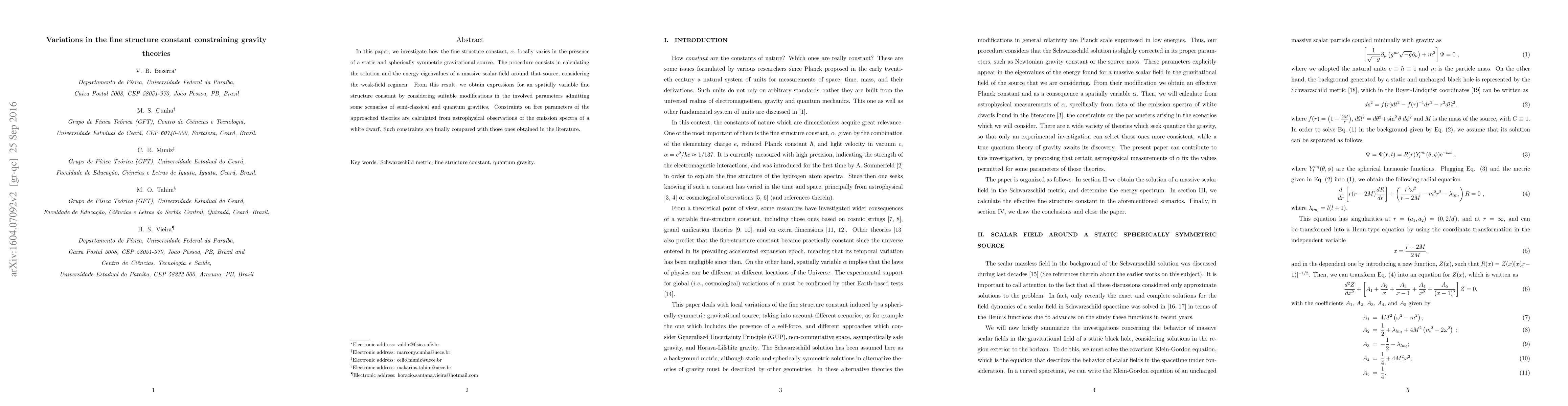 In this paper, we investigate how the fine structure constant, $\alpha$, locally varies in the presence of a static and spherically symmetric gravitational source. The procedure consists in calculating the solution and the energy eigenvalues of a massive scalar field around that source, considering the weak-field regimen. From this result, we obtain expressions for an spatially variable fine structure constant by considering suitable modifications in the involved parameters admitting some scenarios of semi-classical and quantum gravities. Constraints on free parameters of the approached theories are calculated from astrophysical observations of the emission spectra of a white dwarf. Such constraints are finally compared with those ones obtained in the literature.