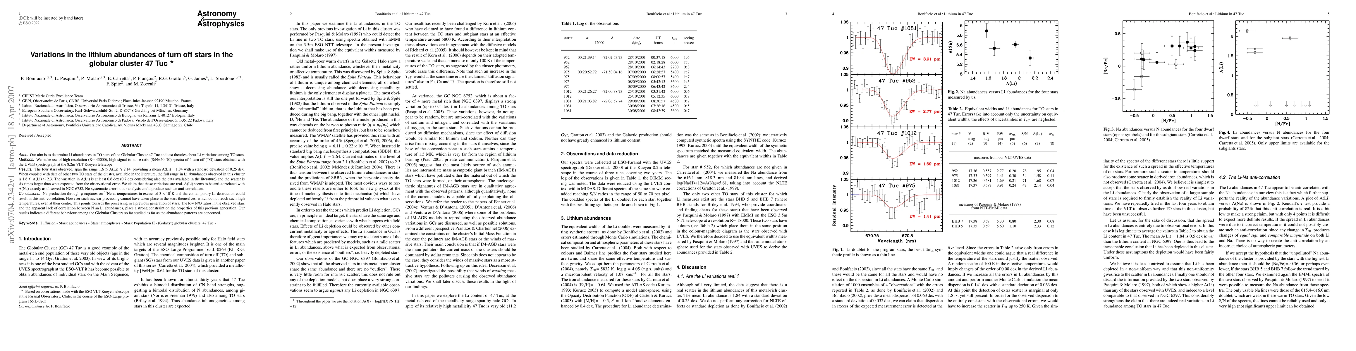 This study investigates lithium abundances in turn off stars of the globular cluster 47 Tuc, revealing significant variations with a range of 0.6 dex. The findings suggest an anti-correlation between lithium and sodium abundances, likely due to nucleosynthesis in earlier stellar generations rather than within the stars themselves.