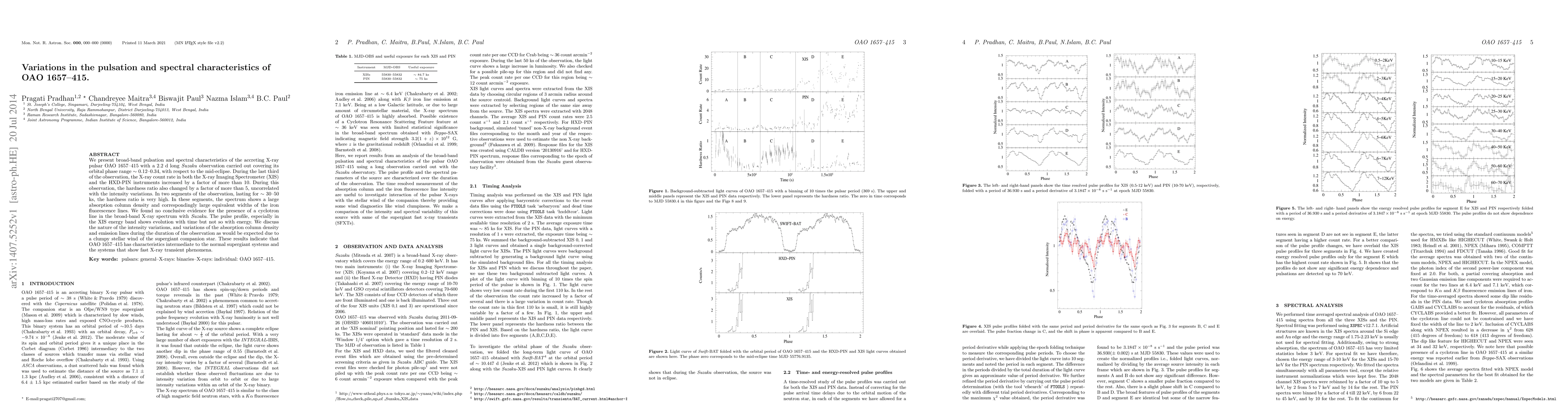 We present broad-band pulsation and spectral characteristics of the accreting X-ray pulsar OAO 1657--415 with a 2.2 d long \emph{Suzaku} observation carried out covering its orbital phase range $\sim$ 0.12--0.34, with respect to the mid-eclipse. During the last third of the observation, the X-ray count rate in both the X-ray Imaging Spectrometer (XIS) and the HXD-PIN instruments increased by a factor of more than 10. During this observation, the hardness ratio also changed by a factor of more than 5, uncorrelated with the intensity variations. In two segments of the observation, lasting for $\sim$ 30--50 ks, the hardness ratio is very high. In these segments, the spectrum shows a large absorption column density and correspondingly large equivalent widths of the iron fluorescence lines. We found no conclusive evidence for the presence of a cyclotron line in the broad-band X-ray spectrum with \emph{Suzaku}. The pulse profile, especially in the XIS energy band shows evolution with time but not so with energy. We discuss the nature of the intensity variations, and variations of the absorption column density and emission lines during the duration of the observation as would be expected due to a clumpy stellar wind of the supergiant companion star. These results indicate that OAO 1657--415 has characteristics intermediate to the normal supergiant systems and the systems that show fast X-ray transient phenomena.