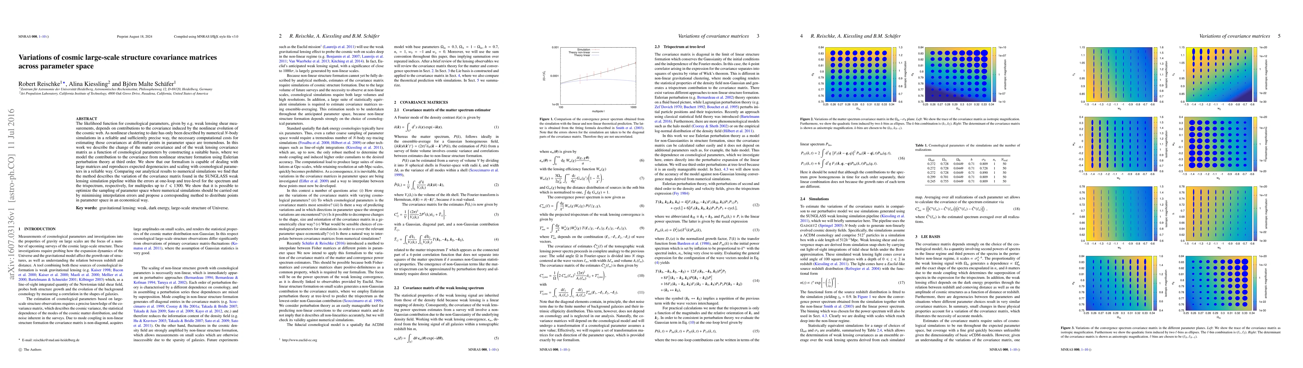 The likelihood function for cosmological parameters, given by e.g. weak lensing shear measurements, depends on contributions to the covariance induced by the nonlinear evolution of the cosmic web. As nonlinear clustering to date has only been described by numerical $N$-body simulations in a reliable and sufficiently precise way, the necessary computational costs for estimating those covariances at different points in parameter space are tremendous. In this work we describe the change of the matter covariance and of the weak lensing covariance matrix as a function of cosmological parameters by constructing a suitable basis, where we model the contribution to the covariance from nonlinear structure formation using Eulerian perturbation theory at third order. We show that our formalism is capable of dealing with large matrices and reproduces expected degeneracies and scaling with cosmological parameters in a reliable way. Comparing our analytical results to numerical simulations we find that the method describes the variation of the covariance matrix found in the SUNGLASS weak lensing simulation pipeline within the errors at one-loop and tree-level for the spectrum and the trispectrum, respectively, for multipoles up to $\ell\leq 1300$. We show that it is possible to optimize the sampling of parameter space where numerical simulations should be carried out by minimising interpolation errors and propose a corresponding method to distribute points in parameter space in an economical way.