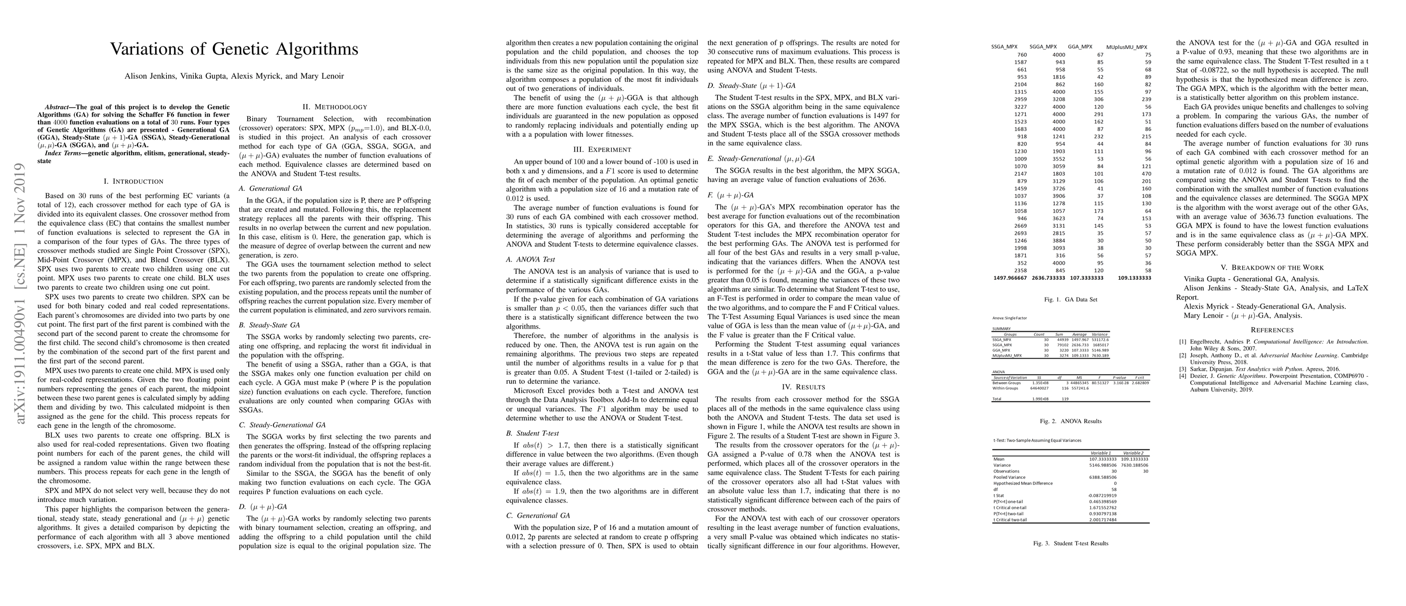This research develops four variations of Genetic Algorithms to solve the Schaffer F6 function, aiming to achieve solutions within 4000 function evaluations over 30 runs. The algorithms include Generational GA, Steady-State (mu+1)-GA, Steady-Generational (mu,mu)-GA, and (mu+mu)-GA.
