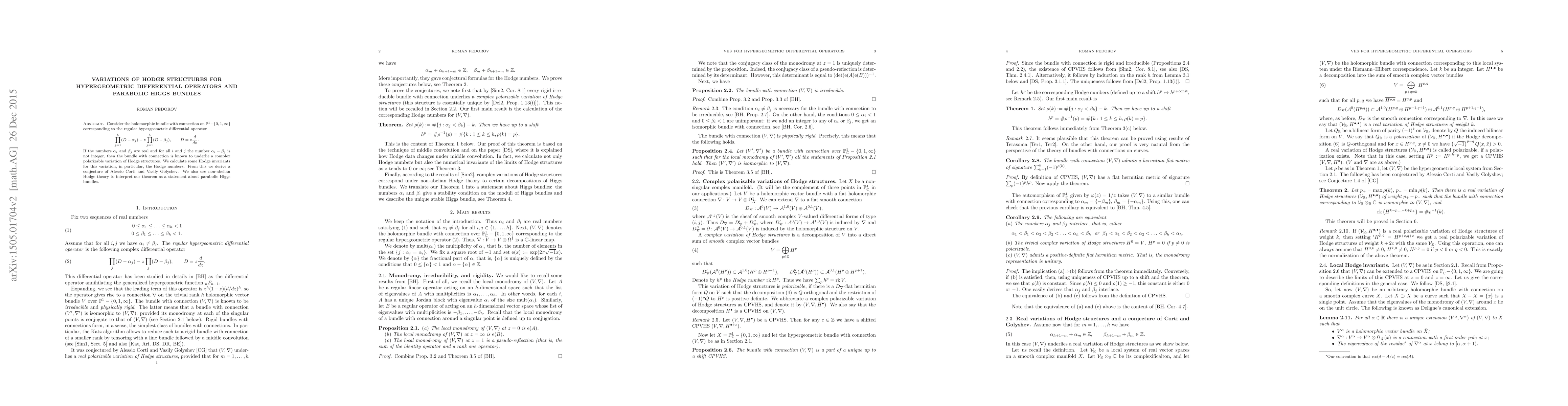 This paper explores the relationship between hypergeometric differential operators and complex variations of Hodge structures, calculating specific Hodge invariants. It also interprets these findings via non-abelian Hodge theory in terms of parabolic Higgs bundles, supporting a conjecture by Corti and Golyshev.