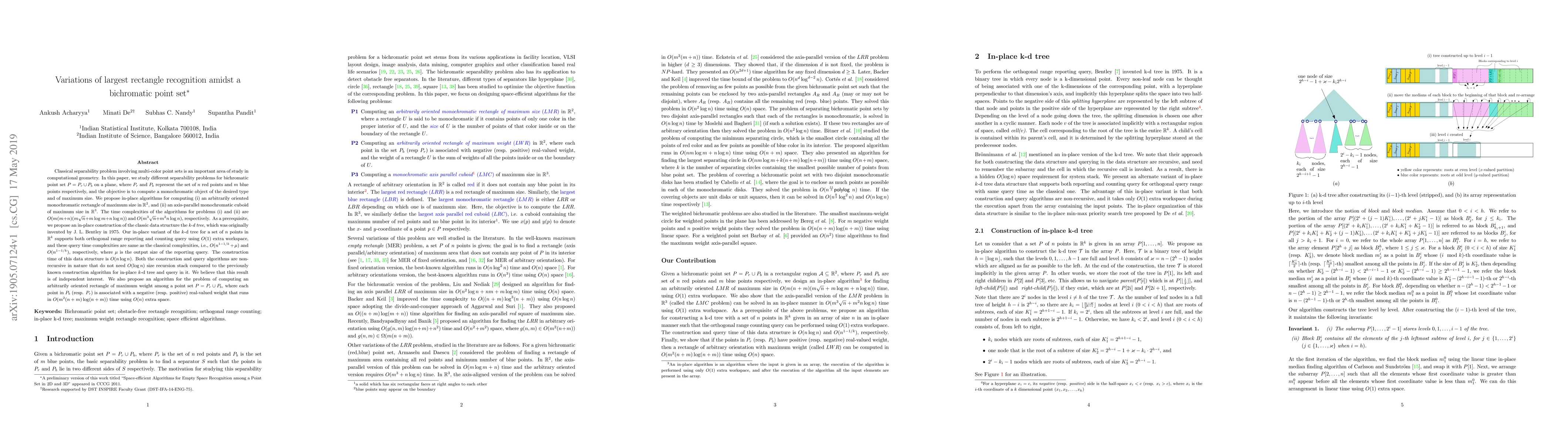 Classical separability problem involving multi-color point sets is an important area of study in computational geometry. In this paper, we study different separability problems for bichromatic point set P=P_r\cup P_b on a plane, where $P_r$ and $P_b$ represent the set of n red points and m blue points respectively, and the objective is to compute a monochromatic object of the desired type and of maximum size. We propose in-place algorithms for computing (i) an arbitrarily oriented monochromatic rectangle of maximum size in R^2, (ii) an axis-parallel monochromatic cuboid of maximum size in R^3. The time complexities of the algorithms for problems (i) and (ii) are O(m(m+n)(m\sqrt{n}+m\log m+n \log n)) and O(m^3\sqrt{n}+m^2n\log n), respectively. As a prerequisite, we propose an in-place construction of the classic data structure the k-d tree, which was originally invented by J. L. Bentley in 1975. Our in-place variant of the $k$-d tree for a set of n points in R^k supports both orthogonal range reporting and counting query using O(1) extra workspace, and these query time complexities are the same as the classical complexities, i.e., O(n^{1-1/k}+\mu) and O(n^{1-1/k}), respectively, where \mu is the output size of the reporting query. The construction time of this data structure is O(n\log n). Both the construction and query algorithms are non-recursive in nature that do not need O(\log n) size recursion stack compared to the previously known construction algorithm for in-place k-d tree and query in it. We believe that this result is of independent interest. We also propose an algorithm for the problem of computing an arbitrarily oriented rectangle of maximum weight among a point set P=P_r \cup P_b, where each point in P_b (resp. P_r) is associated with a negative (resp. positive) real-valued weight that runs in O(m^2(n+m)\log(n+m)) time using O(n) extra space.