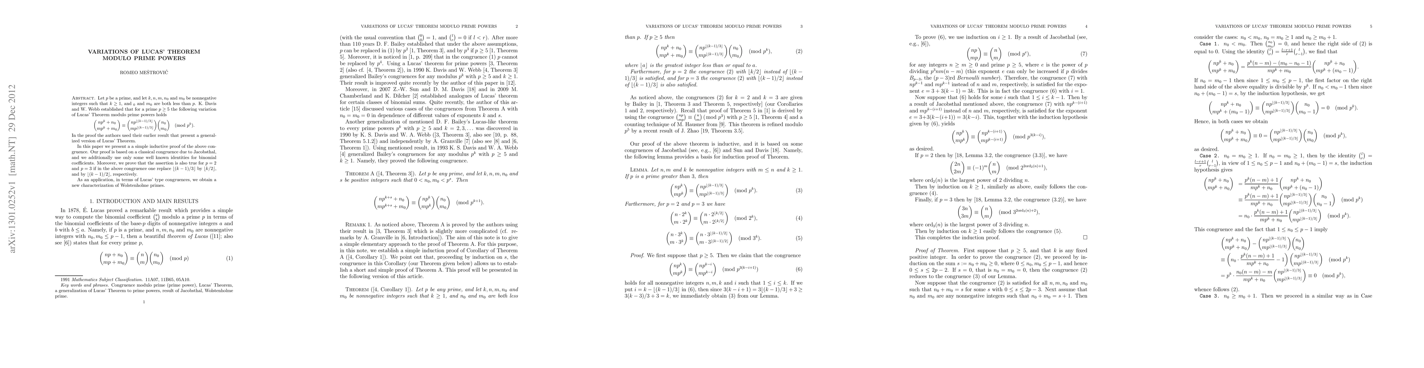 This paper provides a simple inductive proof for a variation of Lucas' Theorem modulo prime powers, originally established by Davis and Webb for primes $p \geq 5$. The authors extend the proof to $p=2$ and $p=3$ with modified floor functions and apply the results to characterize Wolstenholme primes.