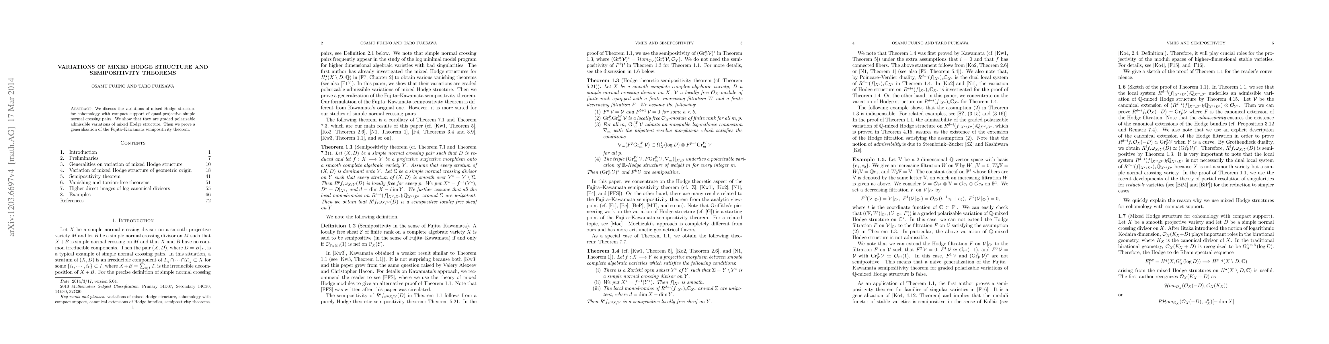 This paper explores variations of mixed Hodge structures for quasi-projective simple normal crossing pairs, demonstrating their graded polarizability and admissibility. It also extends the Fujita-Kawamata semi-positivity theorem to this context.