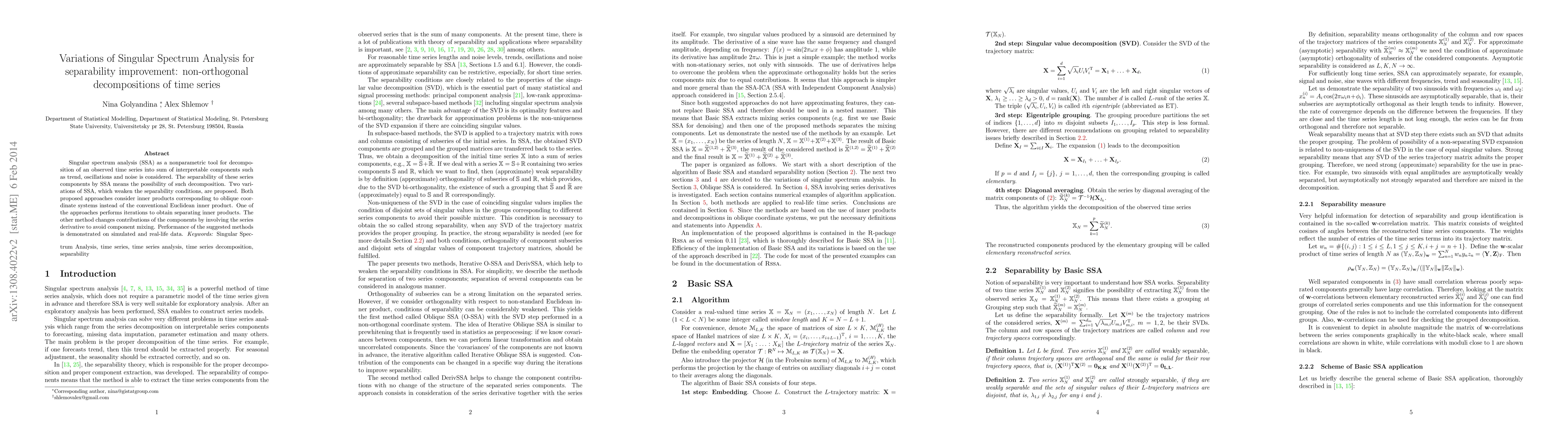 This paper proposes two variations of singular spectrum analysis (SSA) to improve the separability of time series components. Both methods use non-orthogonal decompositions and either iterative processes or series derivatives to avoid component mixing, enhancing the interpretability of SSA-derived components. The effectiveness of these approaches is validated through simulated and real-world data.