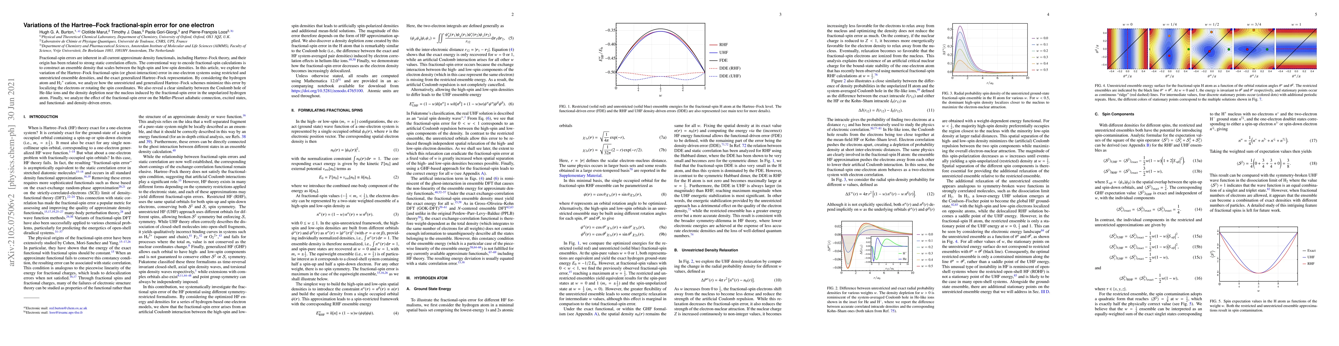 This paper investigates variations in the Hartree-Fock fractional-spin error in one-electron systems, comparing restricted and unrestricted ensemble densities and the exact generalized Hartree-Fock representation. It finds that these schemes minimize the error by localizing electrons or rotating spin coordinates, and highlights a similarity between Coulomb hole effects and density depletion near the nucleus.