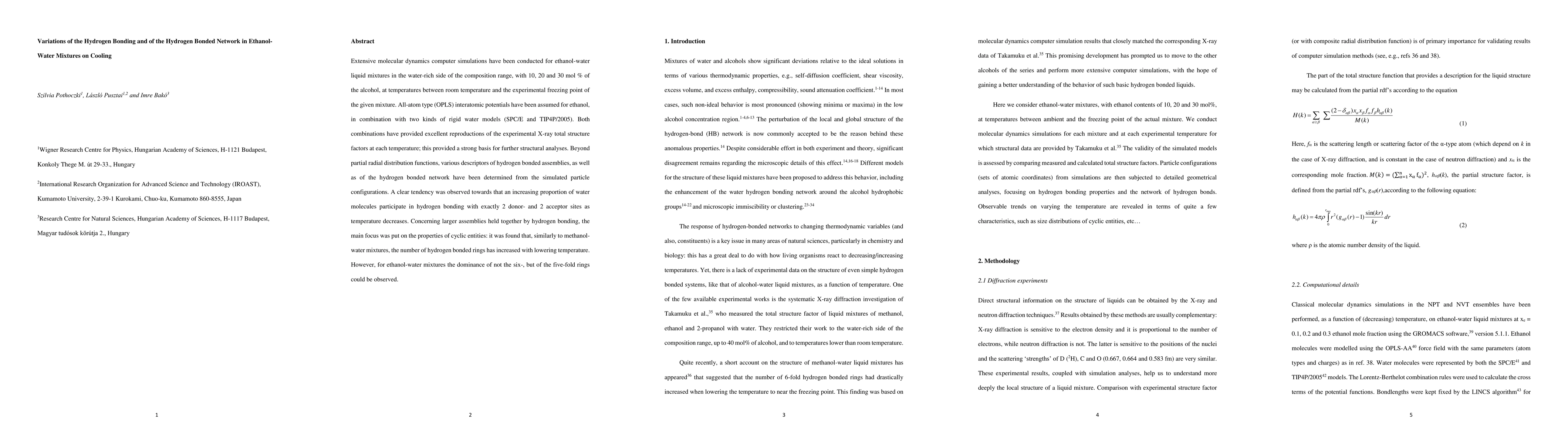 This study uses molecular dynamics simulations to analyze ethanol-water mixtures, finding that as temperature decreases, more water molecules engage in hydrogen bonding with two donor and two acceptor sites. It also reveals that, unlike methanol-water mixtures, ethanol-water mixtures predominantly form five-membered hydrogen-bonded rings at lower temperatures.