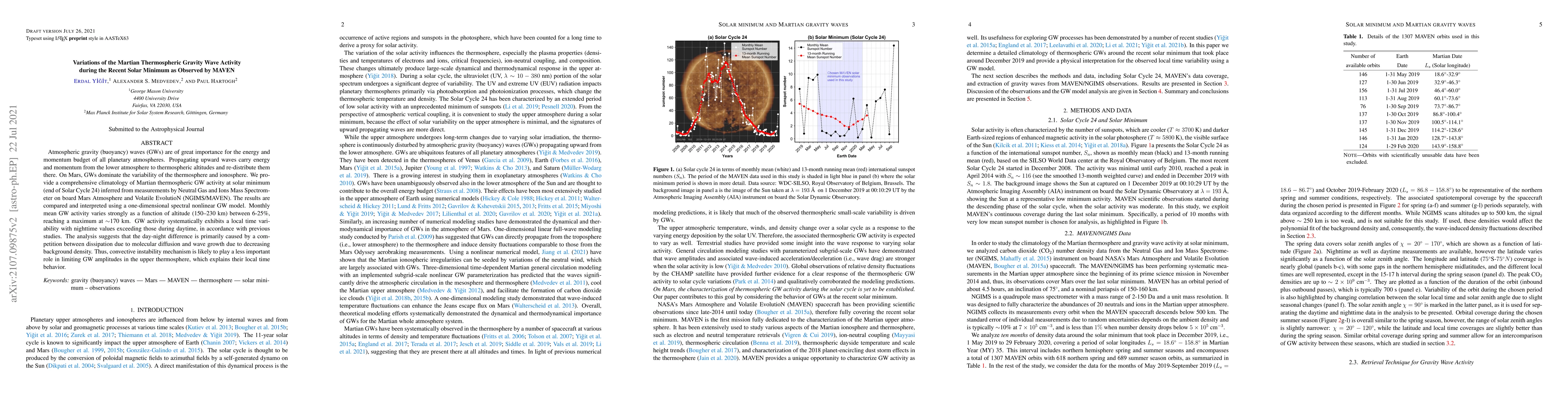This study presents a climatology of Martian thermospheric gravity wave activity during the recent solar minimum, observed by MAVEN's NGIMS, revealing significant variability between 6-25% at altitudes of 150-230 km, with maximum activity around 170 km. The local time variability shows higher nighttime activity, attributed to a balance between dissipation and wave growth rather than convective instability.