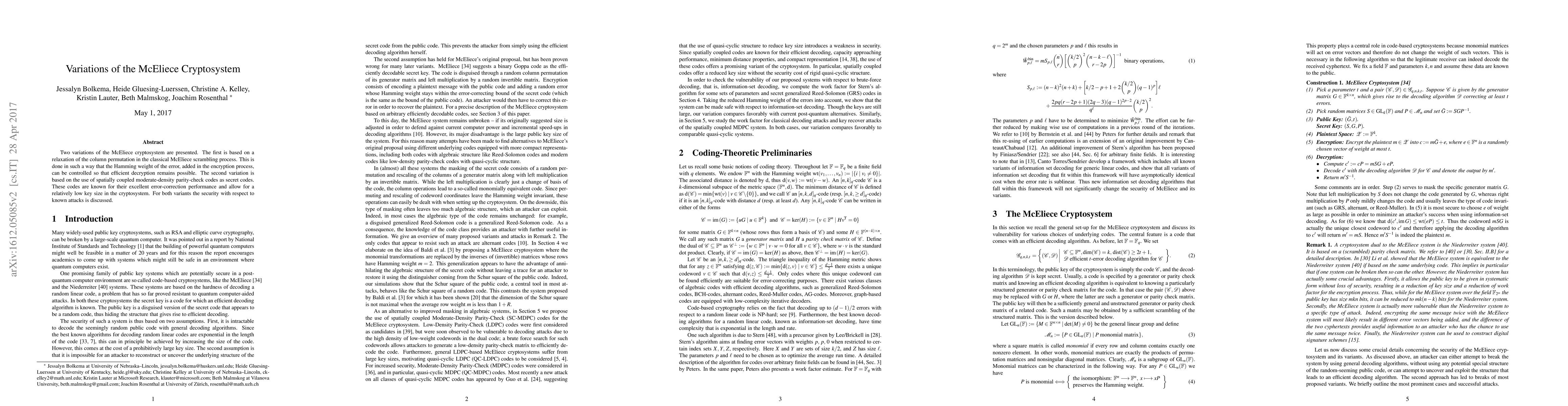 This paper presents two variations of the McEliece cryptosystem: one relaxes column permutation to control error Hamming weight for efficient decryption, and the other uses spatially coupled moderate-density parity-check codes for excellent error-correction performance and low key size, with both variants' security against known attacks analyzed.