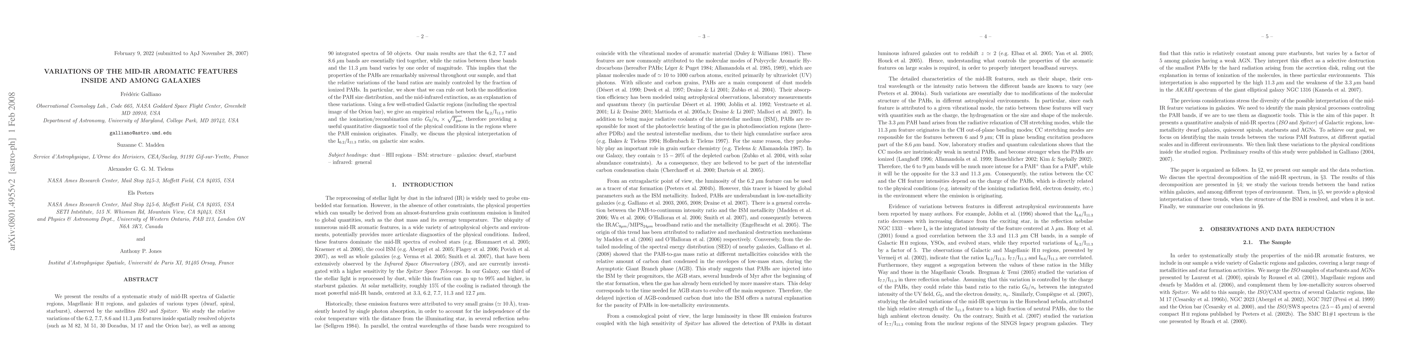 We present the results of a systematic study of mid-IR spectra of Galactic regions, Magellanic HII regions, and galaxies of various types (dwarf, spiral, starburst), observed by the satellites ISO and Spitzer. We study the relative variations of the 6.2, 7.7, 8.6 and 11.3 micron features inside spatially resolved objects (such as M82, M51, 30 Doradus, M17 and the Orion Bar), as well as among 90 integrated spectra of 50 objects. Our main results are that the 6.2, 7.7 and 8.6 micron bands are essentially tied together, while the ratios between these bands and the 11.3 micron band varies by one order of magnitude. This implies that the properties of the PAHs are remarkably universal throughout our sample, and that the relative variations of the band ratios are mainly controled by the fraction of ionized PAHs. In particular, we show that we can rule out both the modification of the PAH size distribution, and the mid-infrared extinction, as an explanation of these variations. Using a few well-studied Galactic regions (including the spectral image of the Orion Bar), we give an empirical relation between the I(6.2)/I(11.3) ratio and the ionization/recombination ratio G0/ne.Tgas^0.5, therefore providing a useful quantitative diagnostic tool of the physical conditions in the regions where the PAH emission originates. Finally, we discuss the physical interpretation of the I(6.2)/I(11.3) ratio, on galactic size scales.