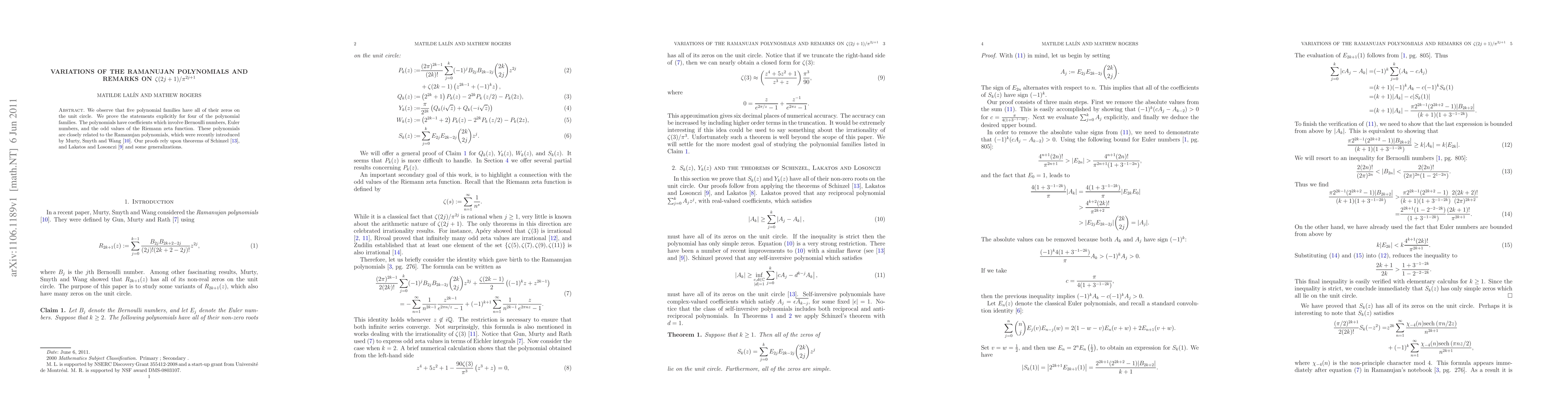 This paper explores five families of polynomials with zeros on the unit circle, proving four explicitly. These polynomials, involving Bernoulli and Euler numbers and odd Riemann zeta values, are variations of Ramanujan polynomials, with proofs grounded in theorems by Schinzel and Lakatos and Losonczi.