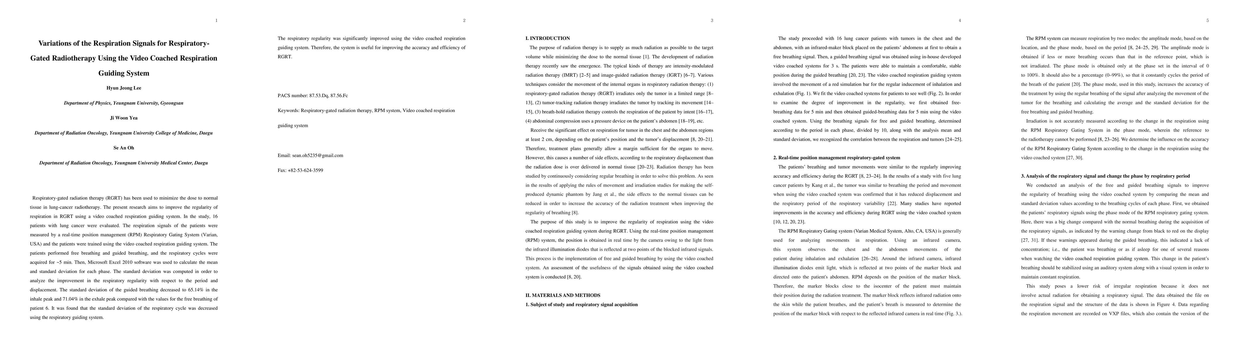 Respiratory-gated radiation therapy (RGRT) has been used to minimize the dose to normal tissue in lung-cancer radiotherapy. The present research aims to improve the regularity of respiration in RGRT using a video coached respiration guiding system. In the study, 16 patients with lung cancer were evaluated. The respiration signals of the patients were measured by a real-time position management (RPM) Respiratory Gating System (Varian, USA) and the patients were trained using the video coached respiration guiding system. The patients performed free breathing and guided breathing, and the respiratory cycles were acquired for ~5 min. Then, Microsoft Excel 2010 software was used to calculate the mean and standard deviation for each phase. The standard deviation was computed in order to analyze the improvement in the respiratory regularity with respect to the period and displacement. The standard deviation of the guided breathing decreased to 65.14% in the inhale peak and 71.04% in the exhale peak compared with the values for the free breathing of patient 6. It was found that the standard deviation of the respiratory cycle was decreased using the respiratory guiding system. 2 The respiratory regularity was significantly improved using the video coached respiration guiding system. Therefore, the system is useful for improving the accuracy and efficiency of RGRT.