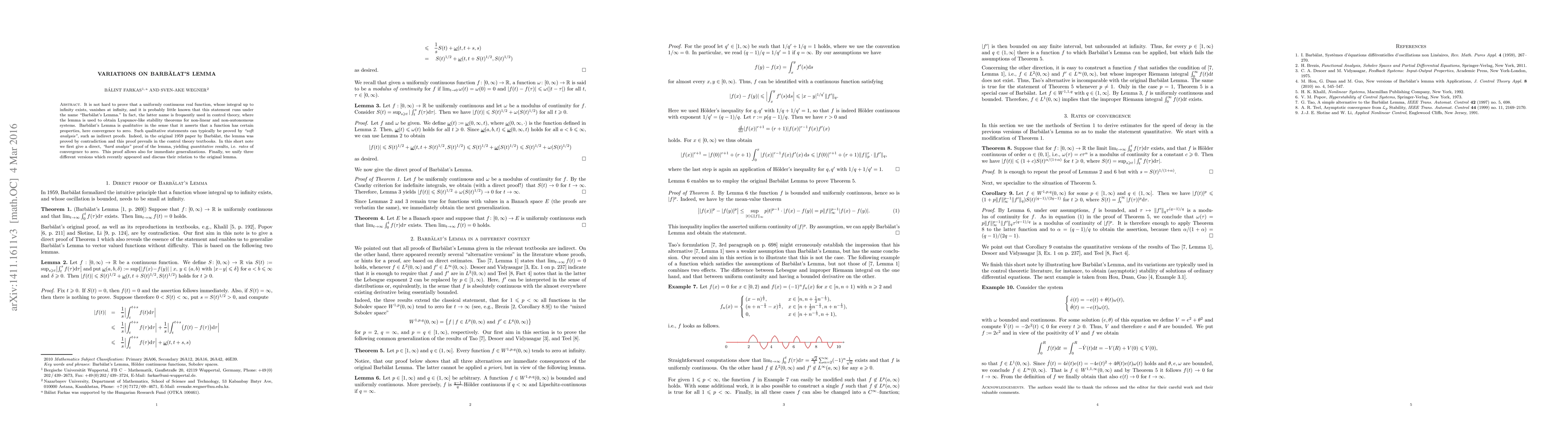 It is not hard to prove that a uniformly continuous real function, whose integral up to infinity exists, vanishes at infinity, and it is probably little known that this statement runs under the name "Barbalat's Lemma." In fact, the latter name is frequently used in control theory, where the lemma is used to obtain Lyapunov-like stability theorems for non-linear and non-autonomous systems. Barbalat's Lemma is qualitative in the sense that it asserts that a function has certain properties, here convergence to zero. Such qualitative statements can typically be proved by "soft analysis", such as indirect proofs. Indeed, in the original 1959 paper by Barbalat, the lemma was proved by contradiction and this proof prevails in the control theory textbooks. In this short note we first give a direct, "hard analyis" proof of the lemma, yielding quantitative results, i.e. rates of convergence to zero. This proof allows also for immediate generalizations. Finally, we unify three different versions which recently appeared and discuss their relation to the original lemma.