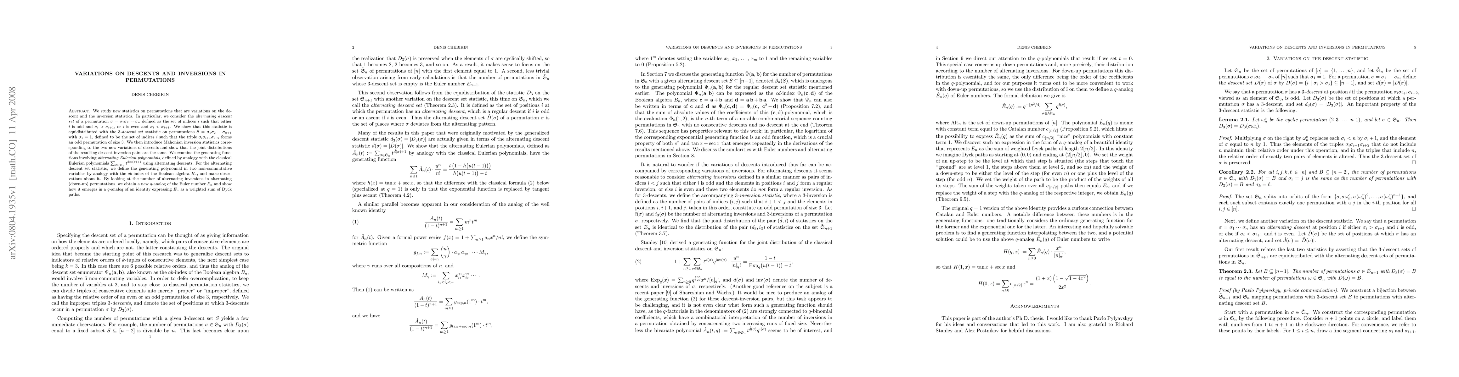 We study new statistics on permutations that are variations on the descent and the inversion statistics. In particular, we consider the alternating descent set of a permutation sigma = sigma_1sigma_2...sigma_n defined as the set of indices i such that either i is odd and sigma_i > sigma_{i+1}, or i is even and sigma_i < sigma_{i+1}. We show that this statistic is equidistributed with the 3-descent set statistic on permutations sigma = sigma_1sigma_2...sigma_{n+1} with sigma_1 = 1, defined to be the set of indices i such that the triple sigma_i sigma_{i+1} sigma_{i+2} forms an odd permutation of size 3. We then introduce Mahonian inversion statistics corresponding to the two new variations of descents and show that the joint distributions of the resulting descent-inversion pairs are the same. We examine the generating functions involving alternating Eulerian polynomials, defined by analogy with the classical Eulerian polynomials sum_{sigma in S_n} t^{des(sigma)+1} using alternating descents. For the alternating descent set statistic, we define the generating polynomial in two non-commutative variables by analogy with the ab-index of the Boolean algebra B_n, and make observations about it. By looking at the number of alternating inversions in alternating (down-up) permutations, we obtain a new q-analog of the Euler number E_n and show how it emerges in a q-analog of an identity expressing E_n as a weighted sum of Dyck paths.