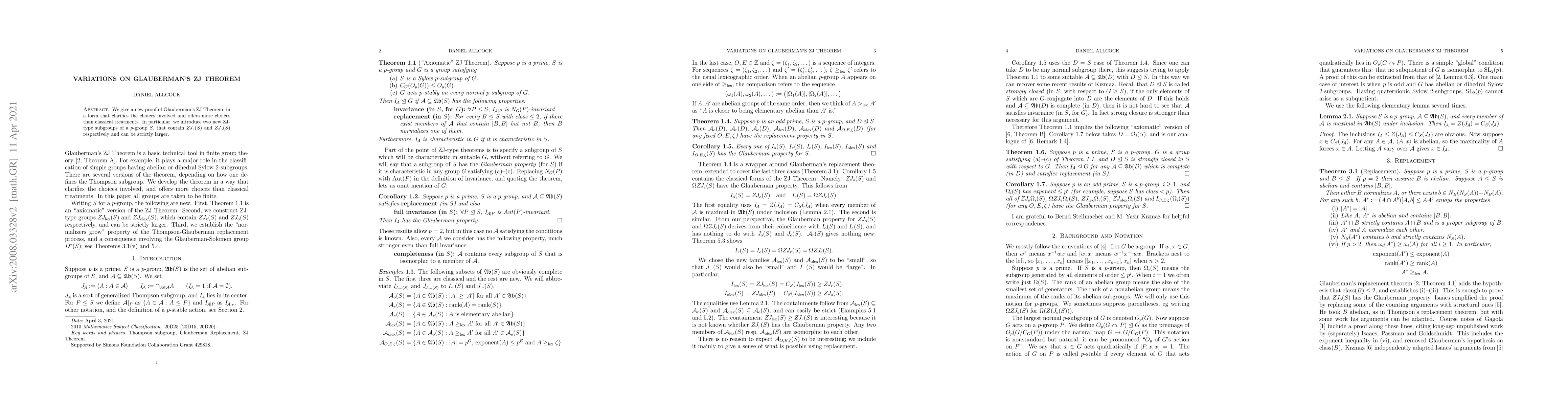 This paper presents a new proof of Glauberman's ZJ Theorem, emphasizing clarity in choices, and introduces two additional ZJ-type subgroups within $p$-groups $S$, which often exceed the size of traditional subgroups $ZJ_r(S)$ and $ZJ_o(S)$.