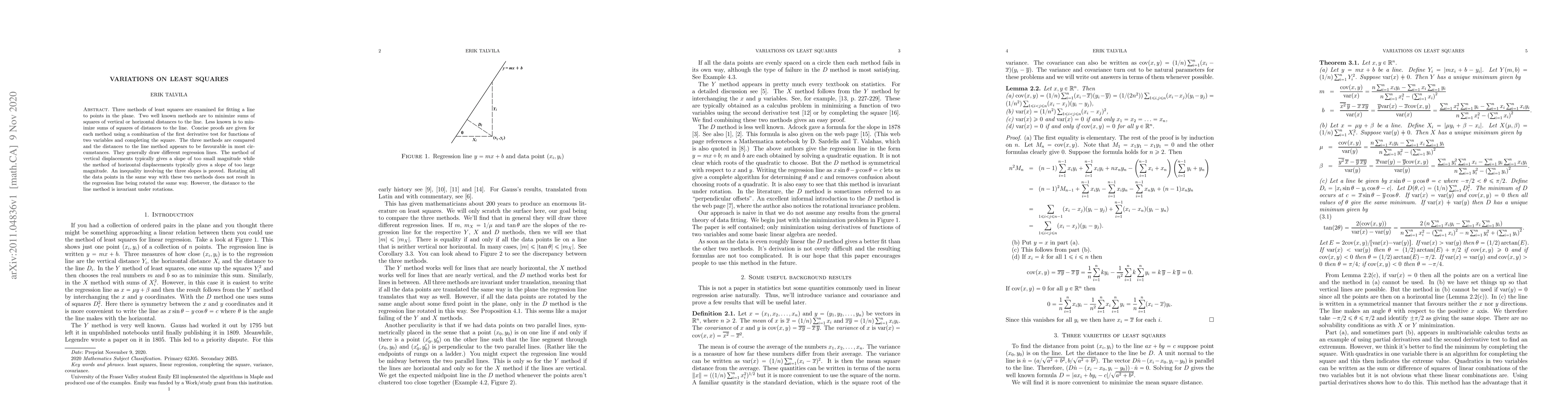 This paper examines three methods of least squares for fitting a line to points in a plane, finding that the distance to the line method generally produces more accurate results and is invariant under rotations, while the other two methods yield slopes with smaller or larger magnitudes.