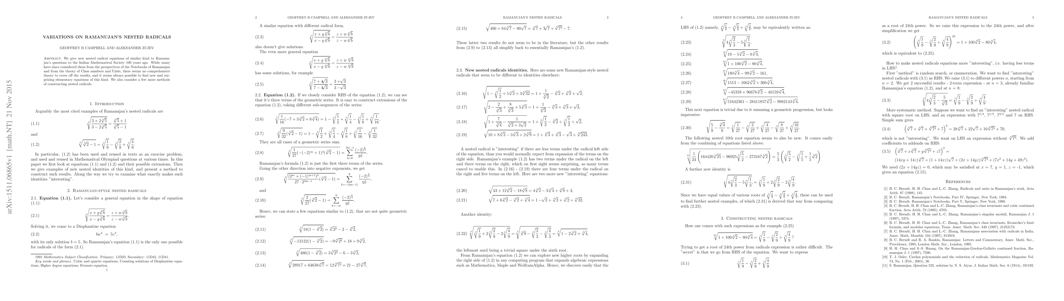 We give new nested radical equations of similar kind to Ramanujan's questions to the Indian Mathematical Society 100 years ago. While many have since considered these from the perspectives of the Notebooks of Ramanujan and from the theory of Class numbers and Units, there seems no comprehensive theory to cover off the results, and it seems always possible to find new and surprizing elementary equations of this kind. We also consider a few more methods of constructing nested radicals.