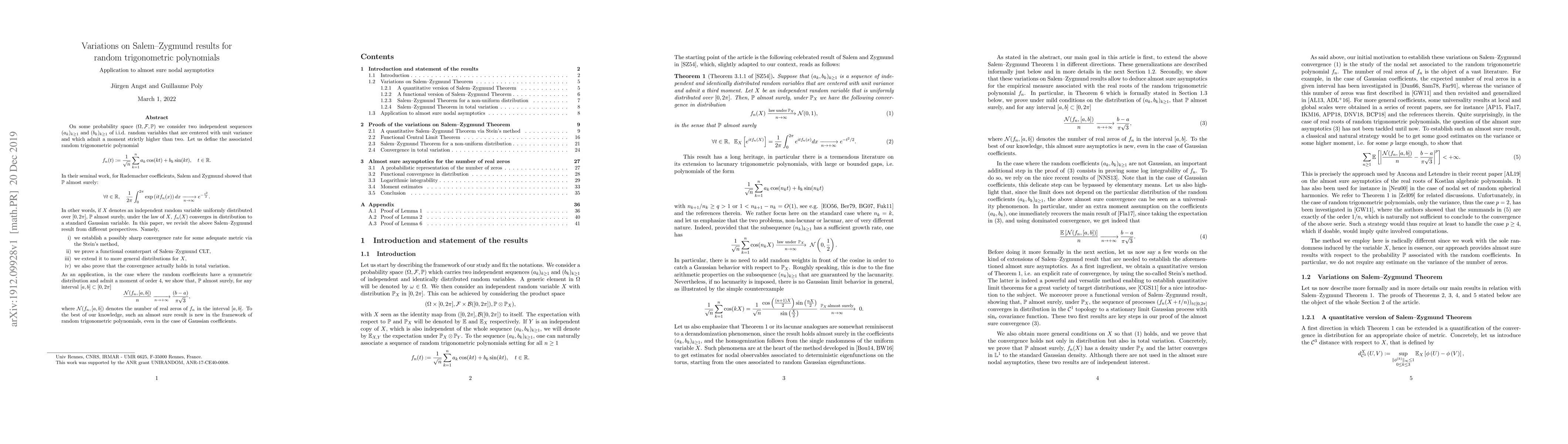 This paper extends Salem-Zygmund results for random trigonometric polynomials, establishing convergence rates and functional central limit theorems for general distributions. It proves almost sure nodal asymptotics for the number of zeros in intervals, providing a new result in the context of random trigonometric polynomials.