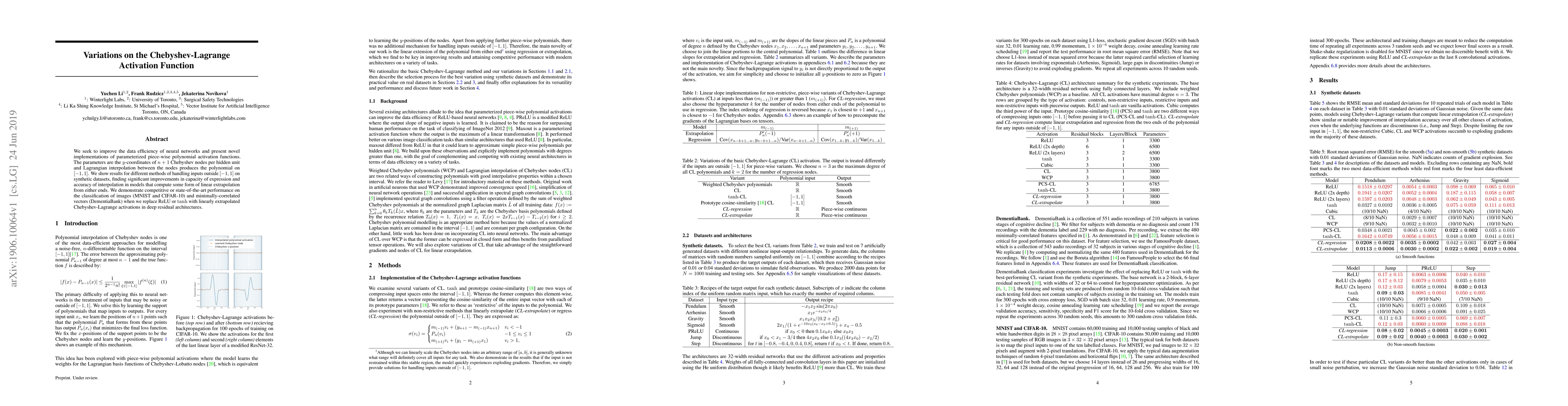 We seek to improve the data efficiency of neural networks and present novel implementations of parameterized piece-wise polynomial activation functions. The parameters are the y-coordinates of n+1 Chebyshev nodes per hidden unit and Lagrangian interpolation between the nodes produces the polynomial on [-1, 1]. We show results for different methods of handling inputs outside [-1, 1] on synthetic datasets, finding significant improvements in capacity of expression and accuracy of interpolation in models that compute some form of linear extrapolation from either ends. We demonstrate competitive or state-of-the-art performance on the classification of images (MNIST and CIFAR-10) and minimally-correlated vectors (DementiaBank) when we replace ReLU or tanh with linearly extrapolated Chebyshev-Lagrange activations in deep residual architectures.
