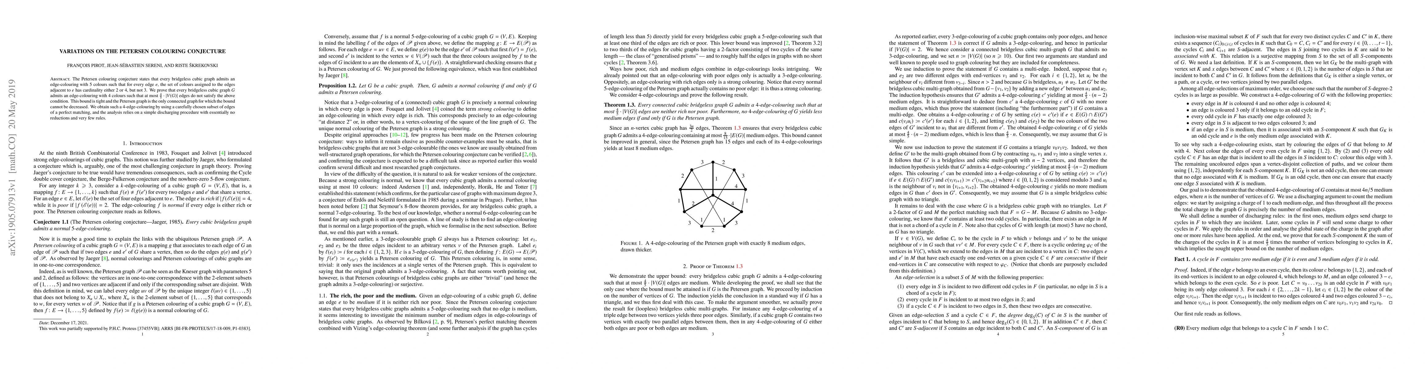 The Petersen colouring conjecture states that every bridgeless cubic graph admits an edge-colouring with $5$ colours such that for every edge $e$, the set of colours assigned to the edges adjacent to $e$ has cardinality either $2$ or $4$, but not $3$. We prove that every bridgeless cubic graph $G$ admits an edge-colouring with $4$ colours such that at most $\frac45\cdot|V(G)|$ edges do not satisfy the above condition. This bound is tight and the Petersen graph is the only connected graph for which the bound cannot be decreased. We obtain such a $4$-edge-colouring by using a carefully chosen subset of edges of a perfect matching, and the analysis relies on a simple discharging procedure with essentially no reductions and very few rules.