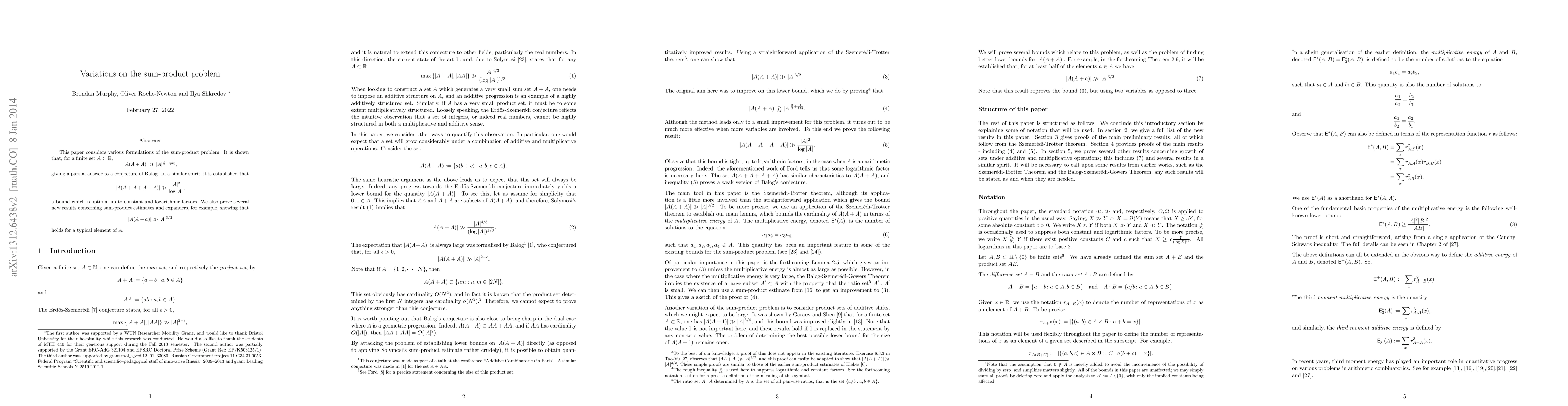 This paper considers various formulations of the sum-product problem. It is shown that, for a finite set $A\subset{\mathbb{R}}$, $$|A(A+A)|\gg{|A|^{\frac{3}{2}+\frac{1}{178}}},$$ giving a partial answer to a conjecture of Balog. In a similar spirit, it is established that $$|A(A+A+A+A)|\gg{\frac{|A|^2}{\log{|A|}}},$$ a bound which is optimal up to constant and logarithmic factors. We also prove several new results concerning sum-product estimates and expanders, for example, showing that $$|A(A+a)|\gg{|A|^{3/2}}$$ holds for a typical element of $A$.