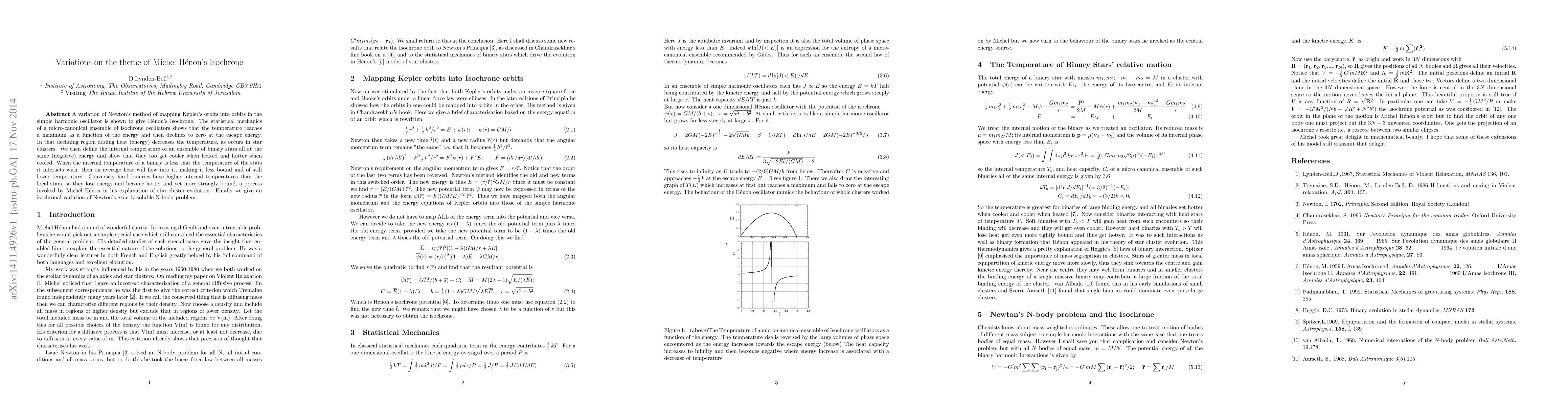 A variation of Newton's method of mapping Kepler's orbits into orbits in the simple harmonic oscillator is shown to give Henon's Isochrone. The statistical mechanics of a micro-canonical ensemble of isochrone oscillators shows that the temperature reaches a maximum as a function of the energy and then declines to zero at the escape energy. In that declining region adding heat (energy) decreases the temperature, as occurs in star clusters. We then define the internal temperature of an ensemble of binary stars all at the same (negative) energy and show that they too get cooler when heated and hotter when cooled. When the internal temperature of a binary is less that the temperature of the stars it interacts with, then on average heat will flow into it, making it less bound and of still lower temperature. Conversely hard binaries have higher internal temperatures than the local stars, so they lose energy and become hotter and yet more strongly bound, a process invoked by Michel Henon in his explanation of star-cluster evolution. Finally we give an isochronal variation of Newton's exactly soluble N-body problem.