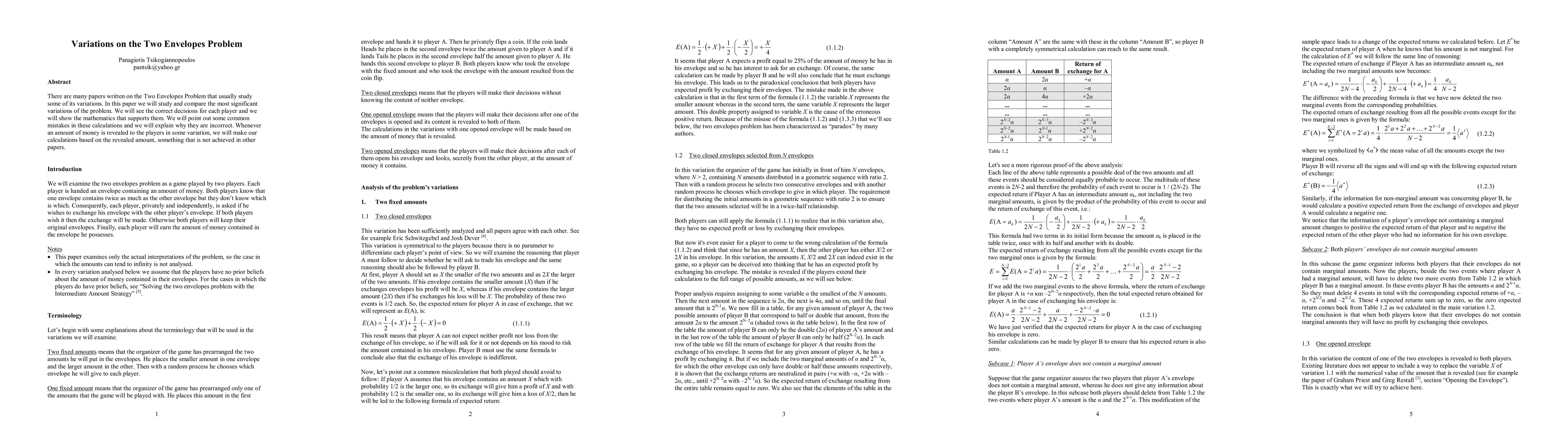 There are many papers written on the Two Envelopes Problem that usually study some of its variations. In this paper we will study and compare the most significant variations of the problem. We will see the correct decisions for each player and we will show the mathematics that supports them. We will point out some common mistakes in these calculations and we will explain why they are incorrect. Whenever an amount of money is revealed to the players in some variation, we will make our calculations based on the revealed amount, something that is not achieved in other papers.
