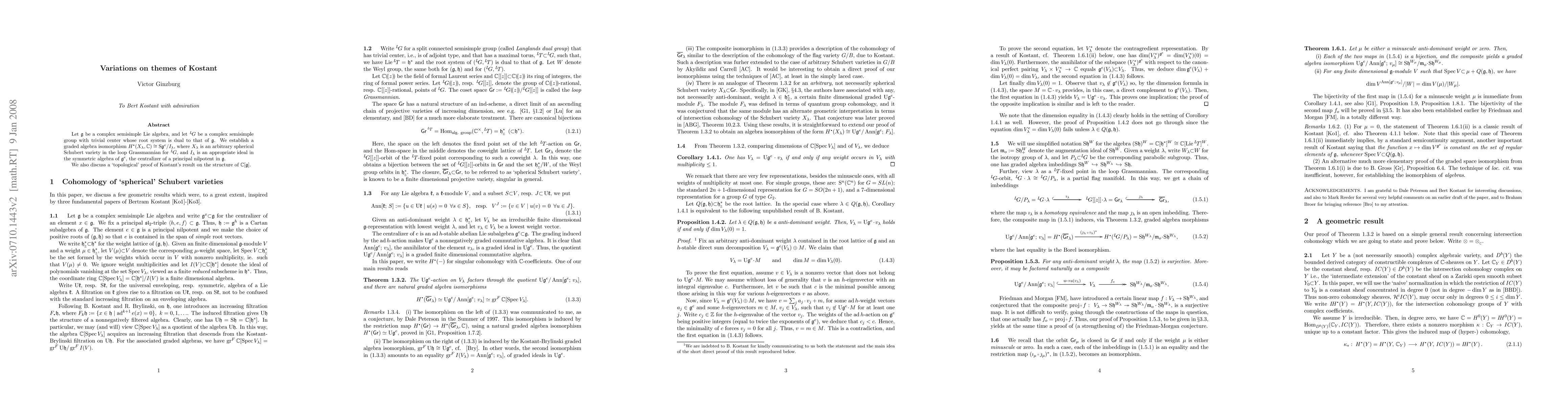 Let g be a complex semisimple Lie algebra and let G' be the Langlands dual group. We give a description of the cohomology algebra of an arbitrary spherical Schubert variety in the loop Grassmannian for G' as a quotient of the form Sym(g^e)/J. Here, J is an appropriate ideal in the symmetric algebra of g^e, the centralizer of a principal nilpotent in g. We also discuss a `topological' proof of Kostant's famous result on the structure of the polynomial algebra on g.