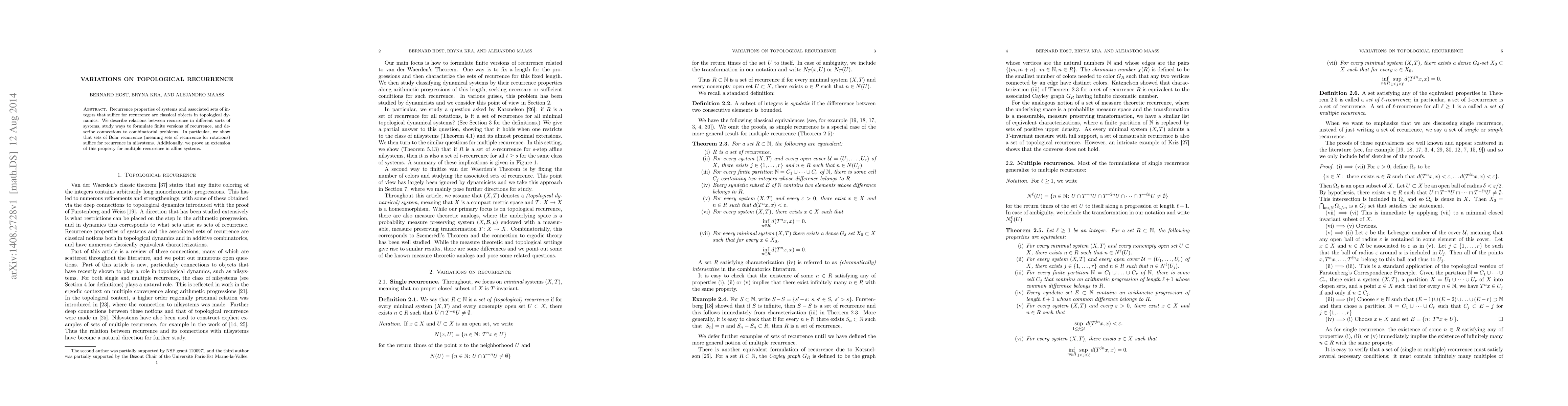 This paper explores recurrence properties in topological dynamics, examining connections between different systems and formulating finite recurrence versions. It demonstrates that Bohr recurrence sets for rotations guarantee recurrence in nilsystems and extends this to multiple recurrence in affine systems.