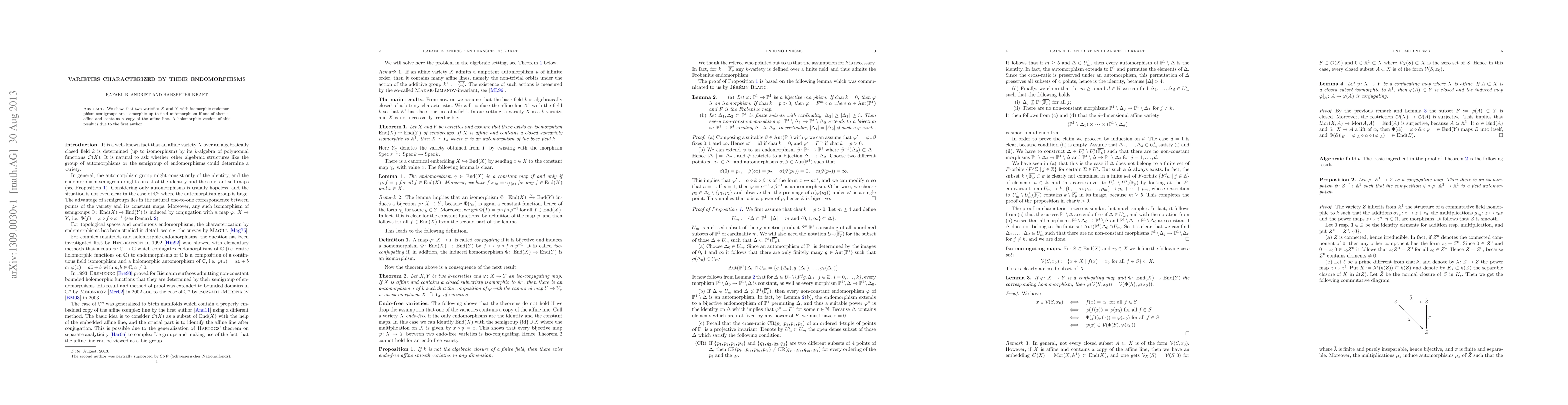 We show that two varieties X and Y with isomorphic endomorphism semigroups are isomorphic up to field automorphism if one of them is affine and contains a copy of the affine line. A holomorphic version of this result is due to the first author.