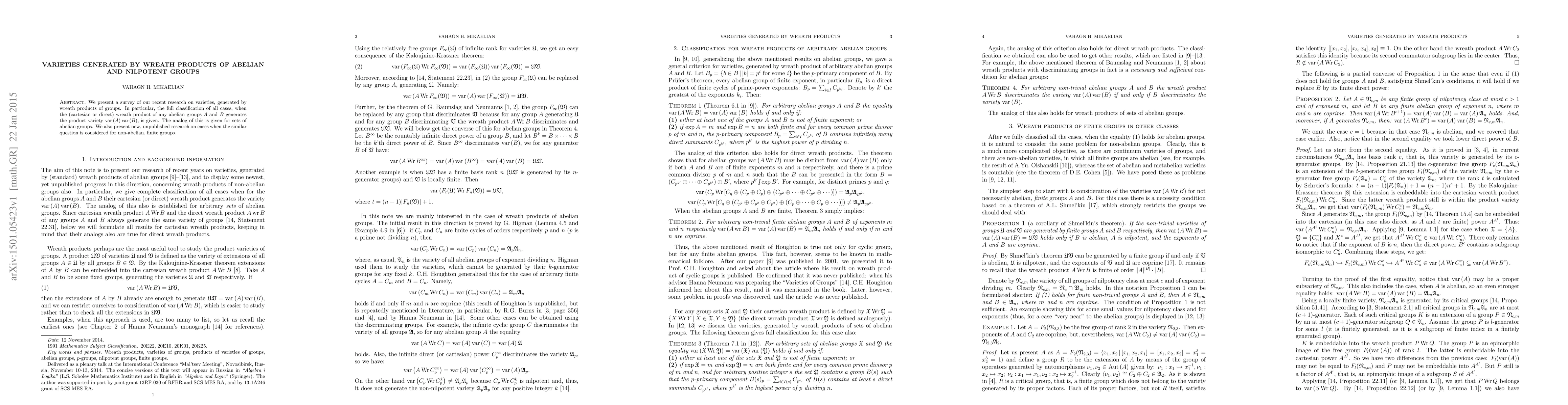 We present a survey of our recent research on varieties, generated by wreath products of groups. In particular, the full classification of all cases, when the (cartesian or direct) wreath product of any abelian groups $A$ and $B$ generates the product variety $\var{A} \var{B}$, is given. The analog of this is given for sets of abelian groups. We also present new, unpublished research on cases when the similar question is considered for non-abelian, finite groups.