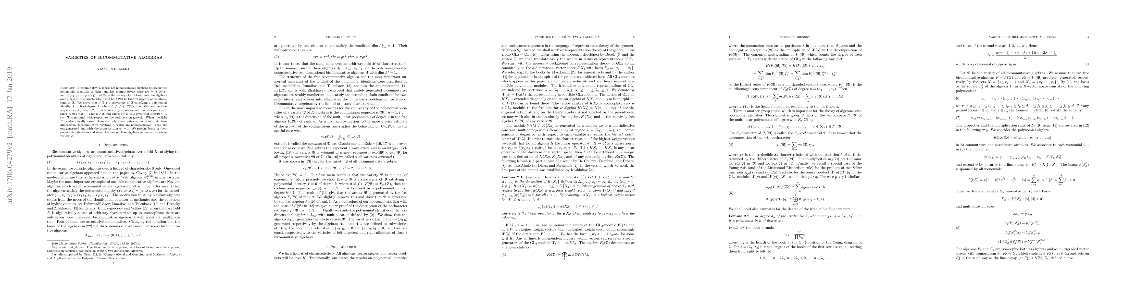 Bicommutative algebras are nonassociative algebras satisfying the polynomial identities of right- and left-commutativity (xy)z=(xz)y and x(yz)=y(xz). We study subvarieties of the variety of all bicommutative algebras over a field of characteristic 0. We prove that if the subvariety satisfies a polynomial identity of degree k, then its codimension sequence is bounded by a polynomial of degree k-1. Since the exponent of the variety of all bicommutative algebras is equal to 2, this gives that it is minimal with respect to the codimension growth. Up to isomorphism there are three one-generated two-dimensional bicommutative algebras with one-dimensional square which are nonassociative. We present bases of their polynomial identities and show that one of these algebras generates the whole variety of bicommutative algebras.