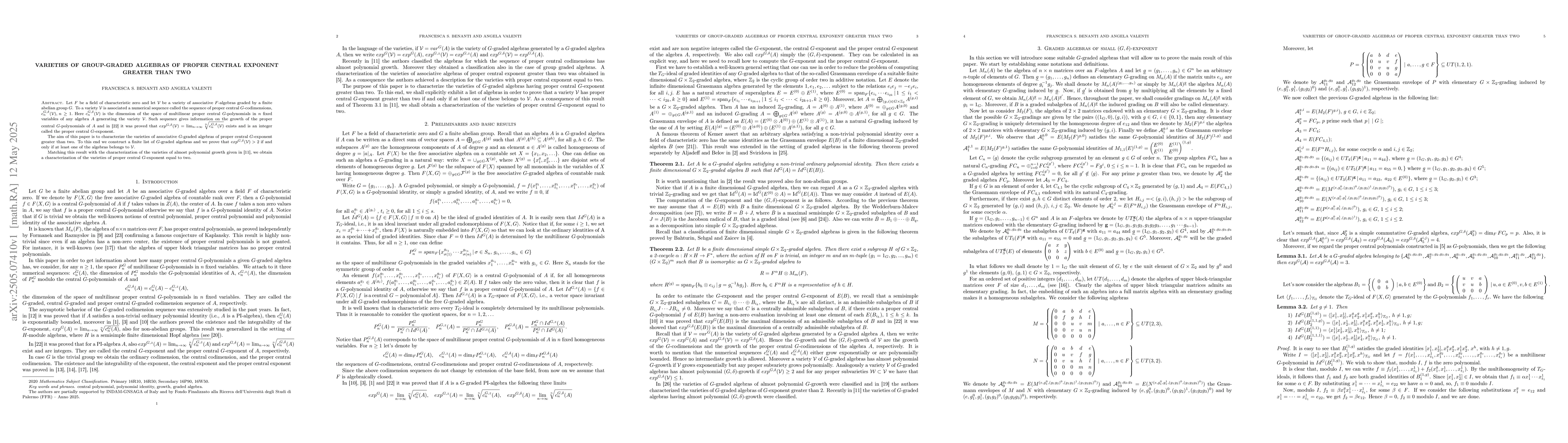 The paper focuses on associative F-algebras graded by a finite abelian group G, examining the sequence of proper central G-codimensions and the proper central G-exponent to characterize varieties of G-graded algebras with proper central G-exponent greater than two.