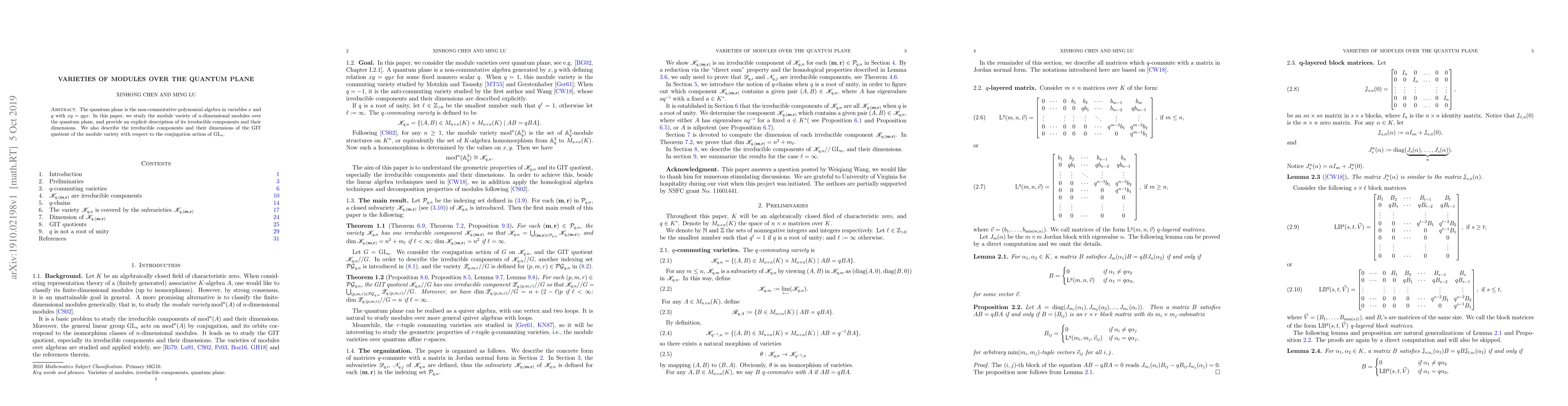 The quantum plane is the non-commutative polynomial algebra in variables $x$ and $y$ with $xy=qyx$. In this paper, we study the module variety of $n$-dimensional modules over the quantum plane, and provide an explicit description of its irreducible components and their dimensions. We also describe the irreducible components and their dimensions of the GIT quotient of the module variety with respect to the conjugation action of ${\rm GL}_n$.